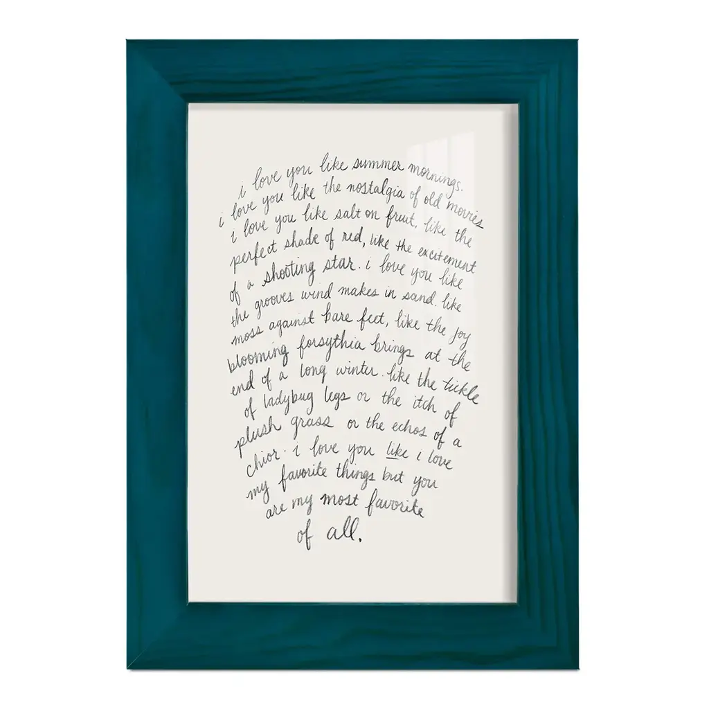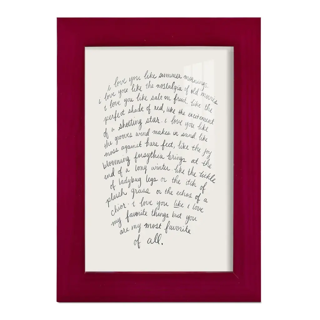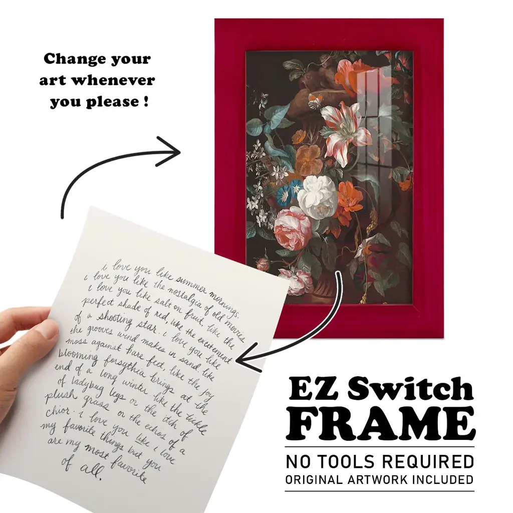Letter to a Lover I -EZ SWITCH Framed Print w/glass-Cherry Red A delightful, framed print. Featuring a solid wood frame with real wood glass. This premium print is giclee quality. In addition, every frame features a removable back and table top stand. This allows you to change your art in the future or to just stand the art on a table for a new look. We are sure you'll enjoy our new series of EZ SWITCH Framed Art. Solid Wood Frame Real Glass Removable / Replaceable Art Built in Tabletop Stand Sizes range from 4x6 up to 12x15 - buy just one or pair them up as sets as you see fit.
