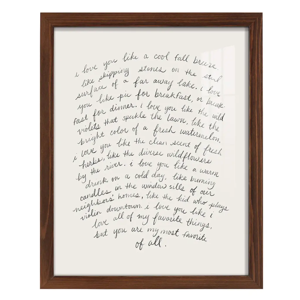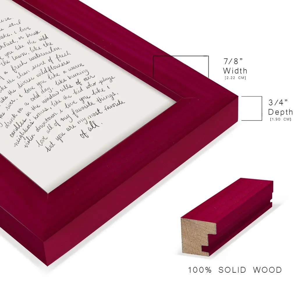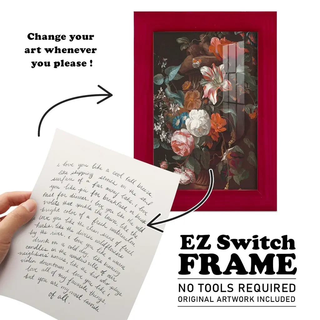 Letter to a Lover II -EZ SWITCH Framed Print w/glass-Cherry Red A delightful, framed print. Featuring a solid wood frame with real wood glass. This premium print is giclee quality. In addition, every frame features a removable back and table top stand. This allows you to change your art in the future or to just stand the art on a table for a new look. We are sure you'll enjoy our new series of EZ SWITCH Framed Art. Solid Wood Frame Real Glass Removable / Replaceable Art Built in Tabletop Stand Sizes range from 4x6 up to 12x15 - buy just one or pair them up as sets as you see fit.
