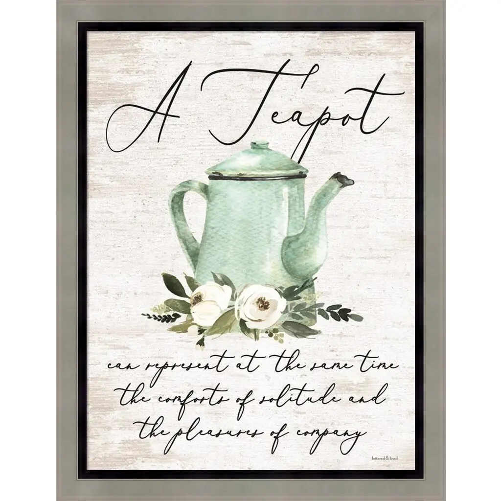 A Teapot by Lettered & Lined is a high quality piece of framed artwork. The finished size of this piece is 17.5" X 22.5". It has a Contemporary Silver Wood w/Black Inner Accent frame and is finished with high quality Acrylic Plexiglass. 100% Satisfaction Guaranteed.