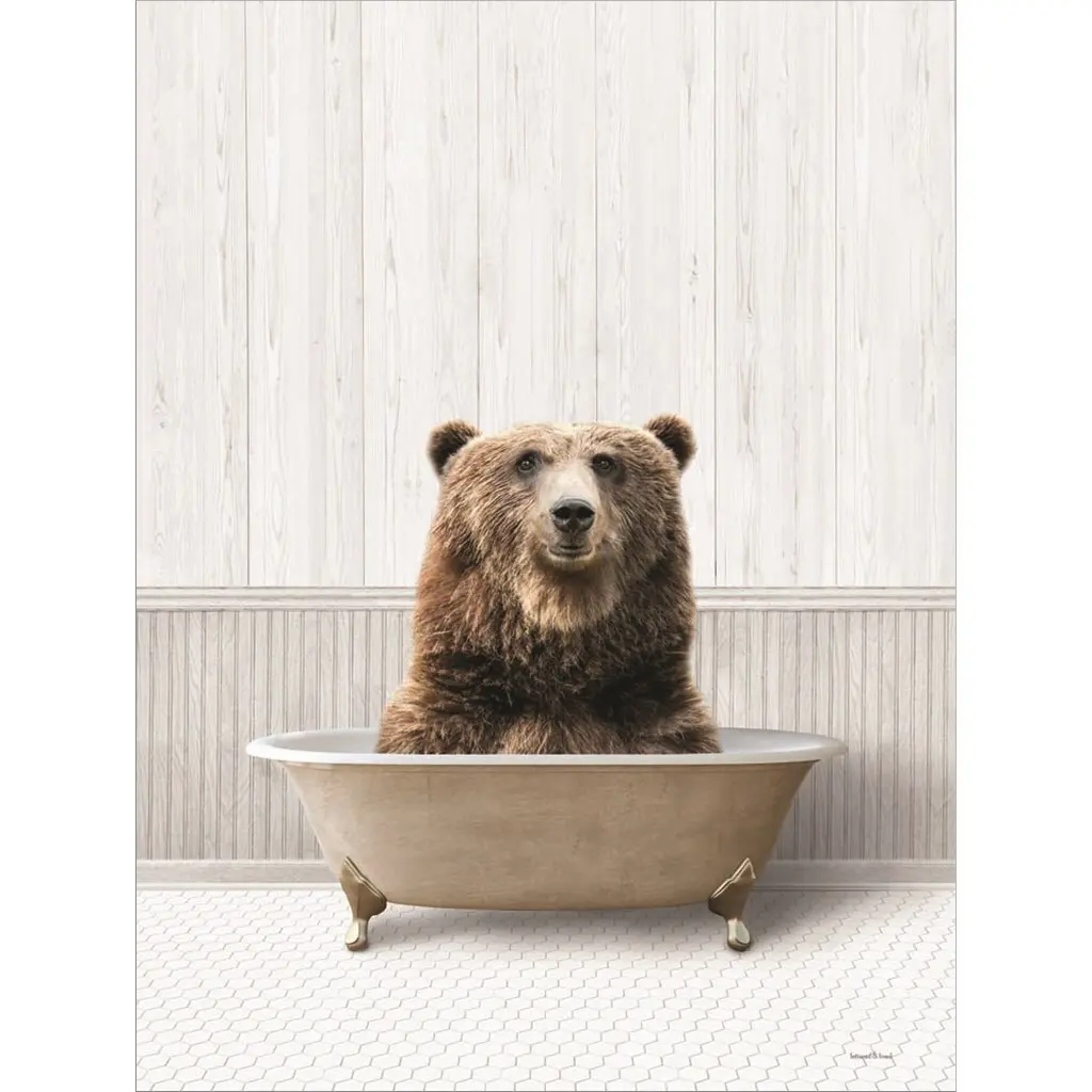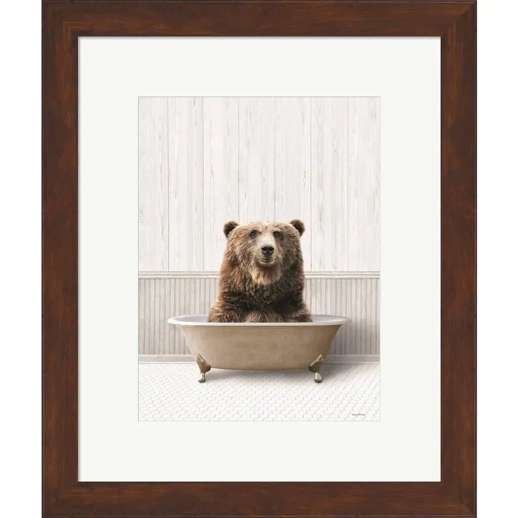Bath Time Bear by Lettered & Lined is a high quality piece of framed artwork. The finished size of this piece is 15.75" X 18.75". It has a Slim Solid Pecan Brown Flat with Satin Finish frame, is single matted and finished with high quality Acrylic Plexiglass. 100% Satisfaction Guaranteed.