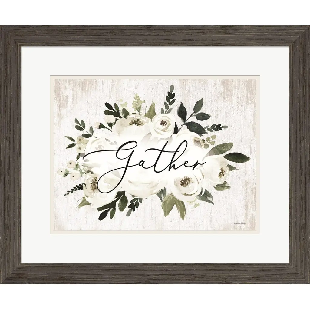 Gather by Lettered & Lined is a high quality piece of framed artwork. The finished size of this piece is 24" X 20". It has a Weathered White Washed Deep Gray frame, is double matted and finished with high quality Acrylic Plexiglass. 100% Satisfaction Guaranteed.