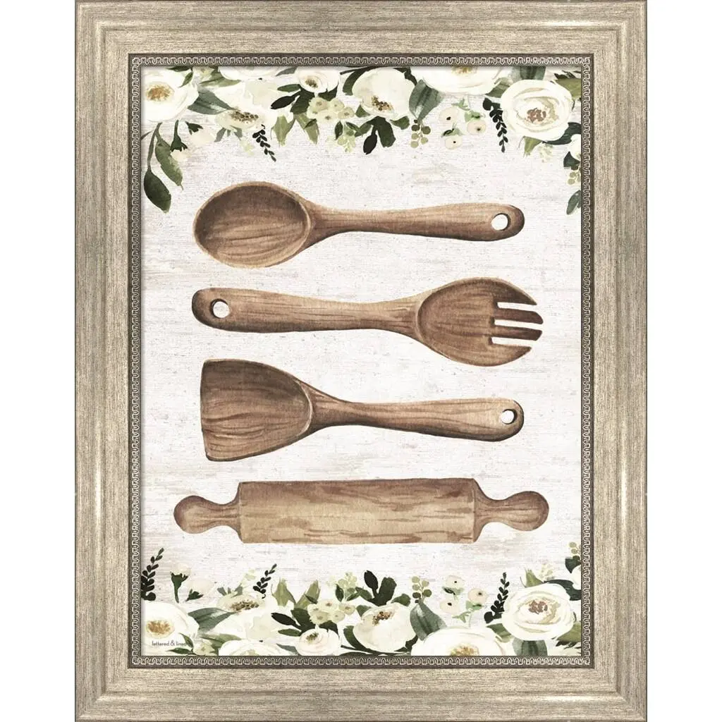 Wooden Utensils by Lettered & Lined is a high quality piece of framed artwork. The finished size of this piece is 15" X 19". It has a Classic Champagne Silver with Ornate Inner Edge frame and is finished with high quality Acrylic Plexiglass. 100% Satisfaction Guaranteed.