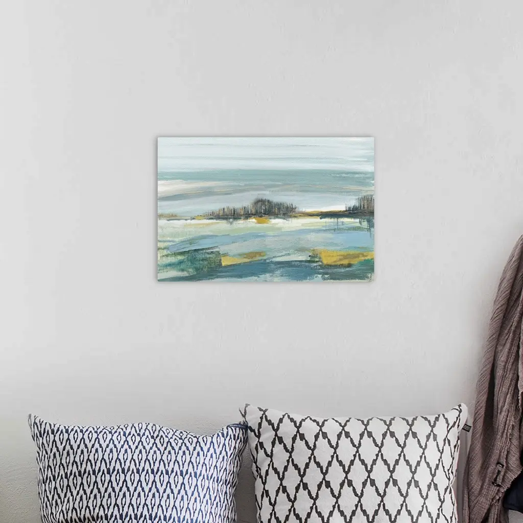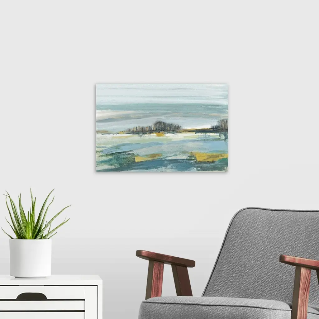 Contemporary painting of an abstract beach landscape in shades of blue, grey, green, and gold.