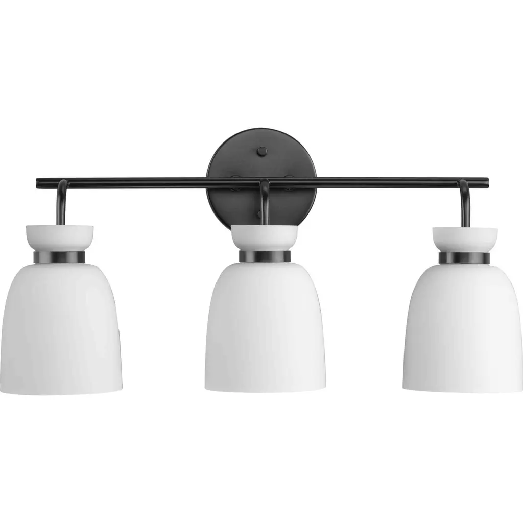 The Lexie Three-Light Vanity Light is full of spunk with a fresh new style for todays home. A slender minimalist frame finished in Matte Black supports opal glass shades with a distinctive cinched metallic collar.The versatile fixture can be mounted facing up or down, offering the perfect amount of illumination to the room.