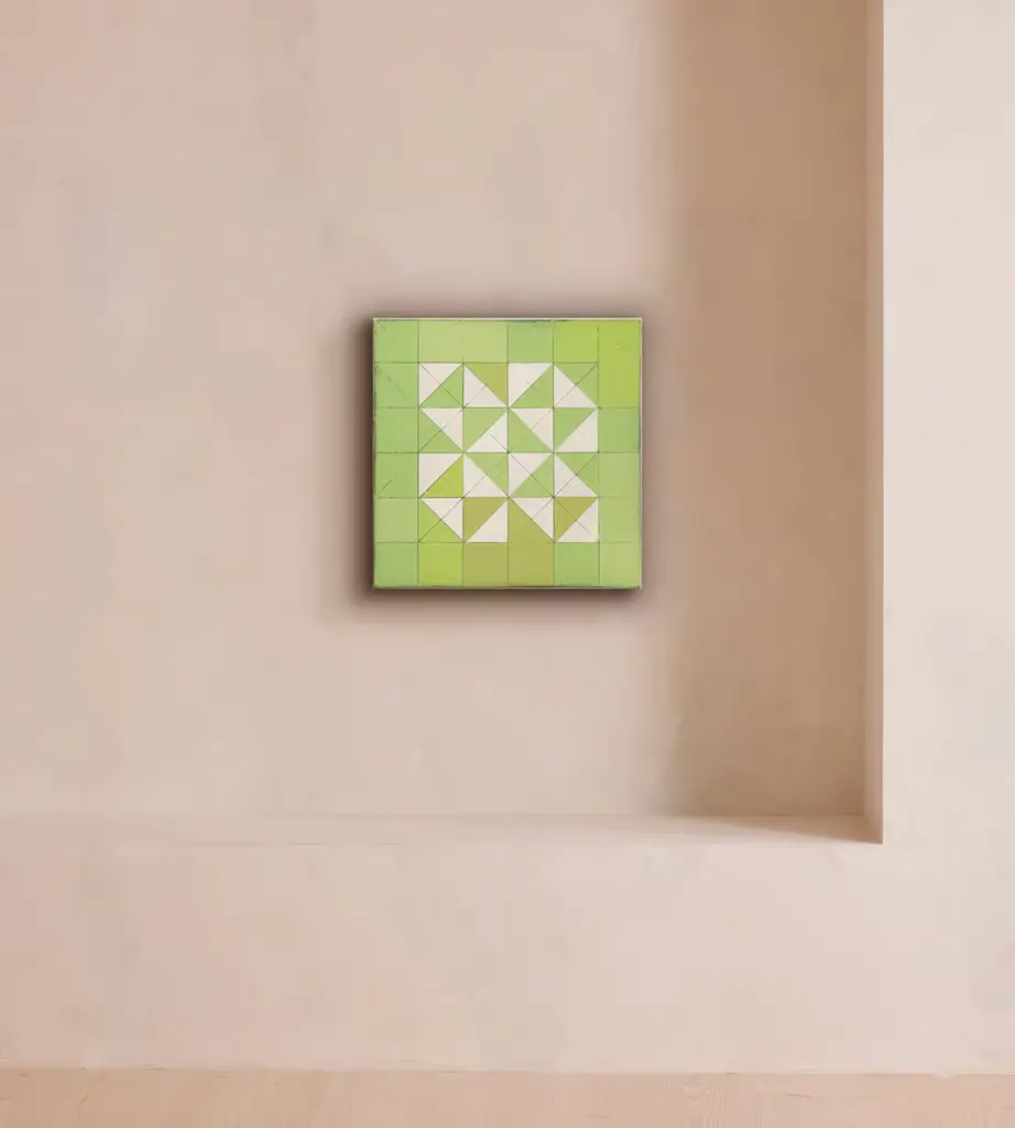 The geometric lines seen in this original abstract painting take inspiration from the traditional tiles, or 'azulejos', seen in Portugal. Ruth Philo's paintings explore abstractaction through colour, light and surface, often drawing inspiration from the artist's everyday life. She mixes materials from pigments to things picked up on her travels on a variety of surfaces such as canvas, linen and wooden panels.