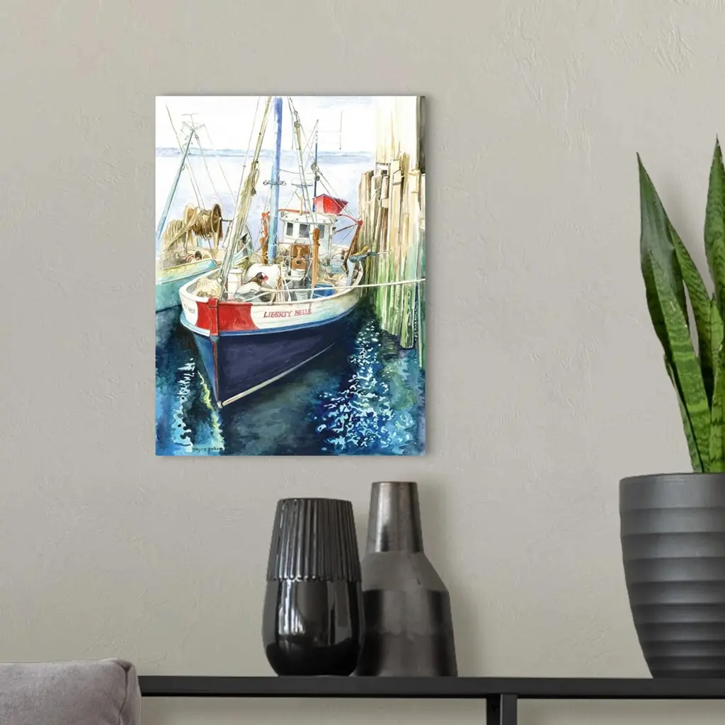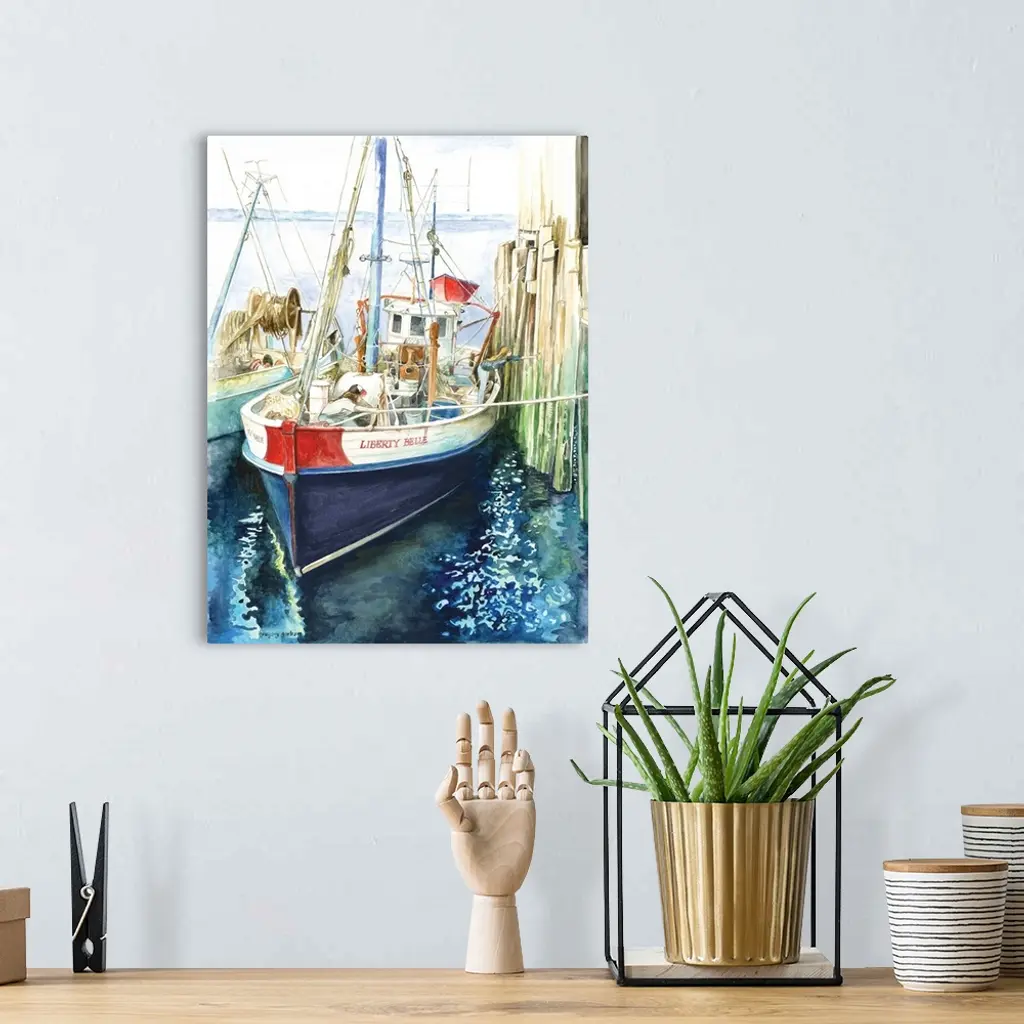 Contemporary watercolor painting of a fishing boat named the "Liberty Bell" tying up to the dock.