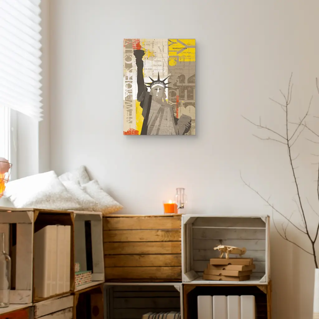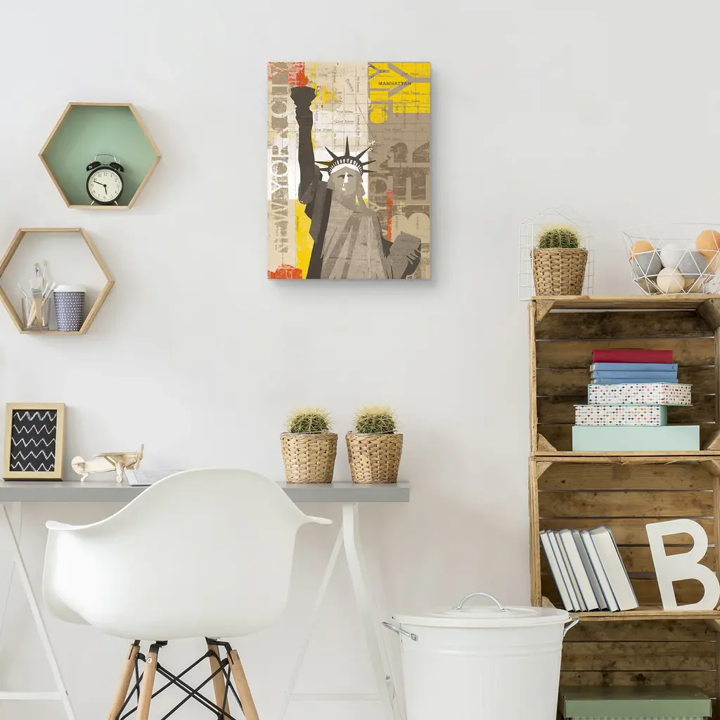 A beautiful graphic illustration of the Statue of Liberty is the focus of this impressively modern canvas print. Rendered in neutral brown tones and surrounded by pockets of brilliant yellow and orange, this iconic landmark makes a perfect piece of decor for your home this Fourth of July season. Produced with full-bleed printing that covers the entirety of the canvas, your new masterpiece is made with state-of-the-art technology that provides museum-quality prints. With quality craftsmanship that guarantees a professional look, this giclee print on canvas is also lightweight and easy to hang. No bulky framing is needed as your new artwork only needs a few nails and a steady hand to hang.