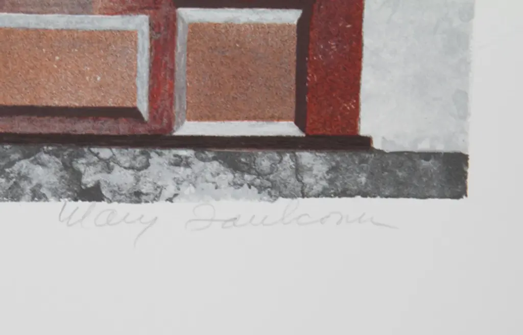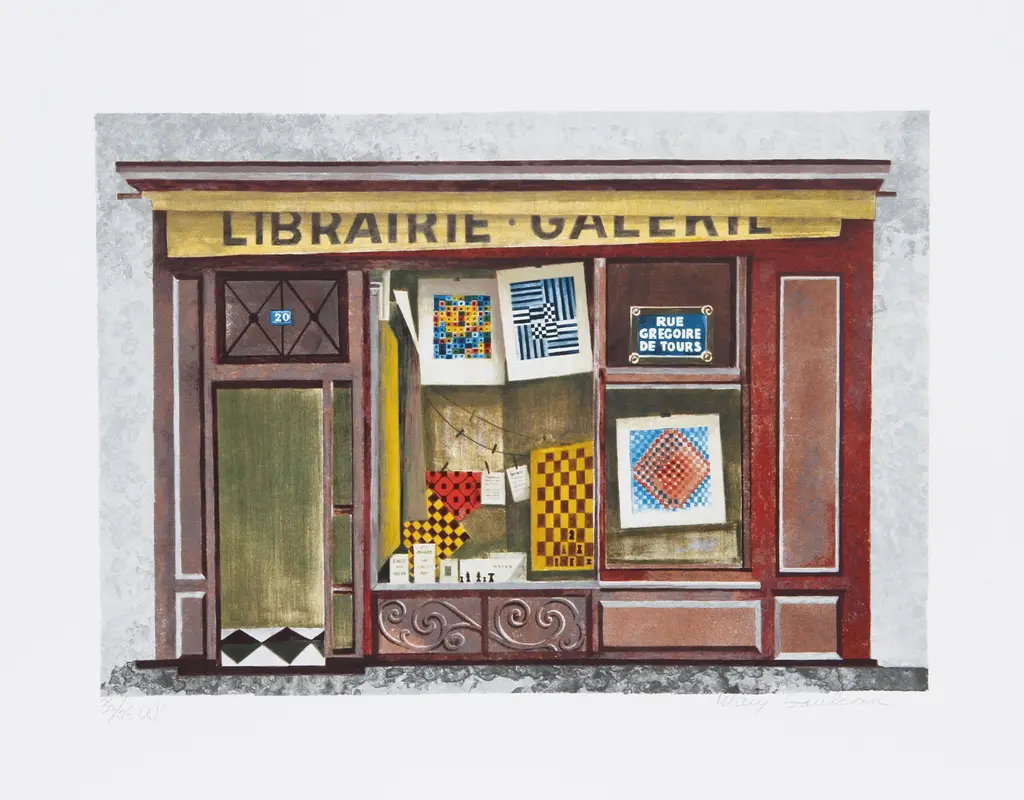 Rendered in hues of brown and red, this storefront image of a gallery library by Mary Faulconer is exemplary of the artist's work in relation to quaint facades of buildings. Hanging throughout the windows, paintings and prints depicting abstracted, geometric art showcase the work inside of the space. Librarie Galerie Mary Faulconer American (1912–2011) Date: circa 1980 Lithograph, signed and numbered in pencil Edition of 250, AP 35 Image Size: 12 x 17 inches Size: 22.5 in. x 27.5 in. (57.15 cm x 69.85 cm)