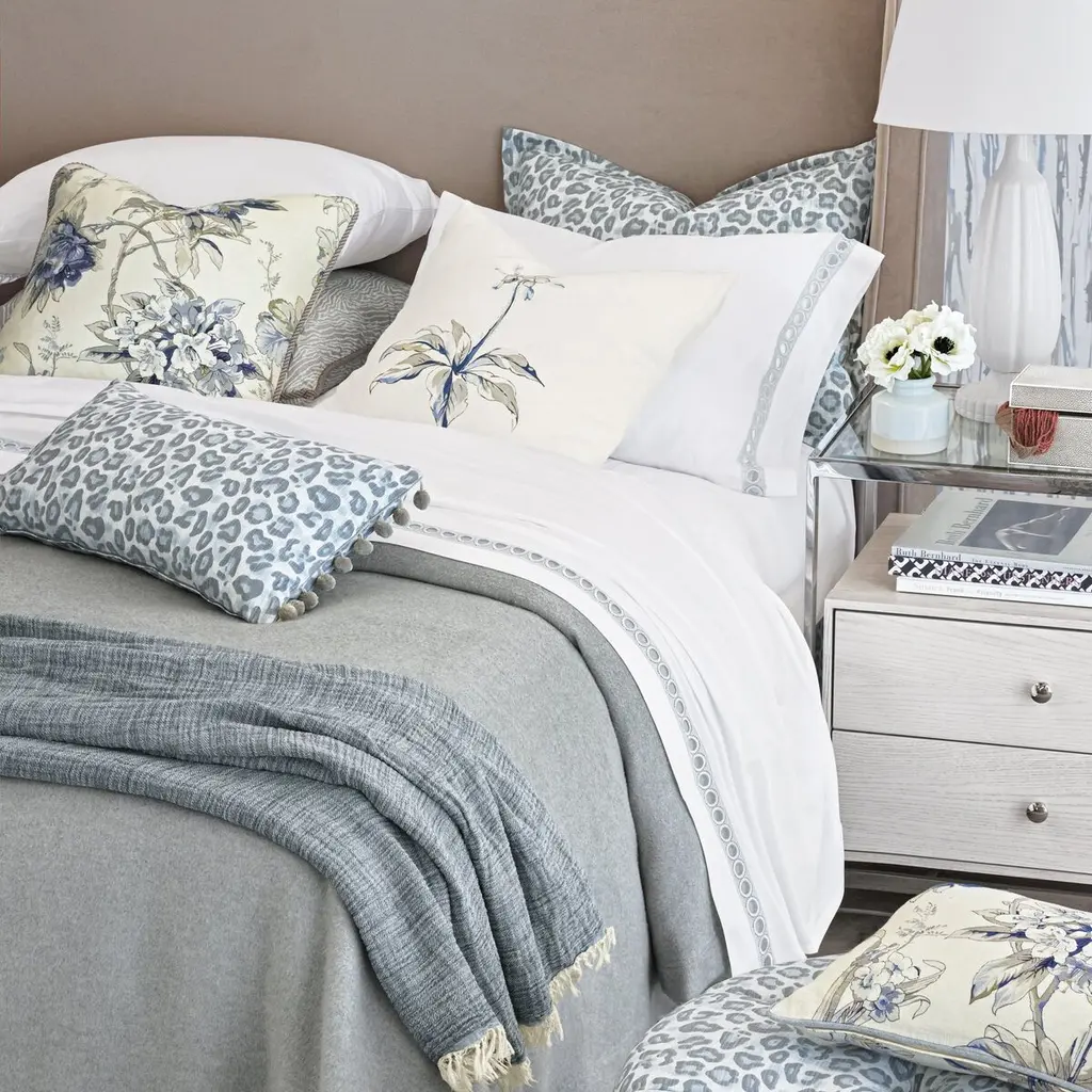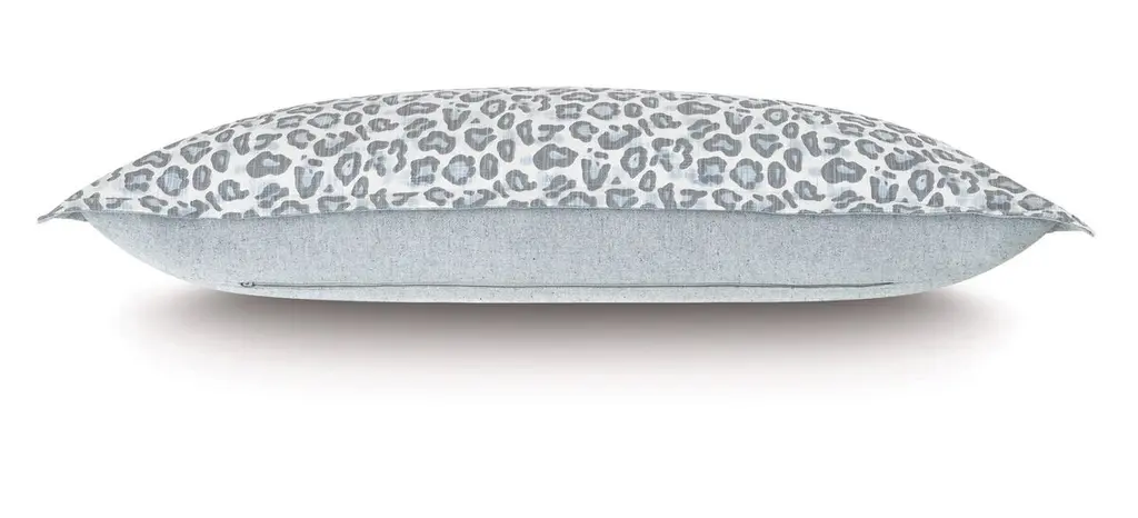 Get in touch with your wild side courtesy of this blue leopard-print pillow sham. The reverse is solid pewter for a more restrained look. Made of cotton and linen, the sham has a feather insert to ensure it feels as luxurious as it looks. Zipper closure.