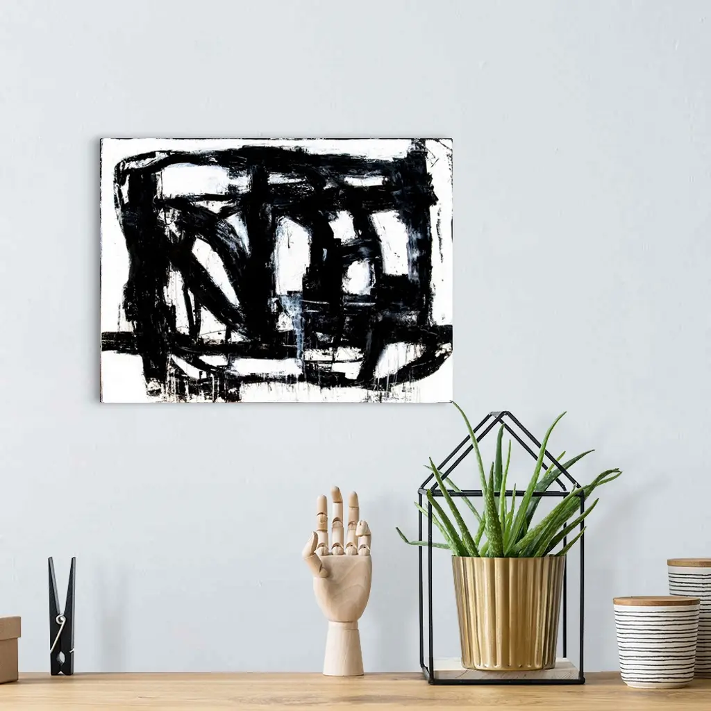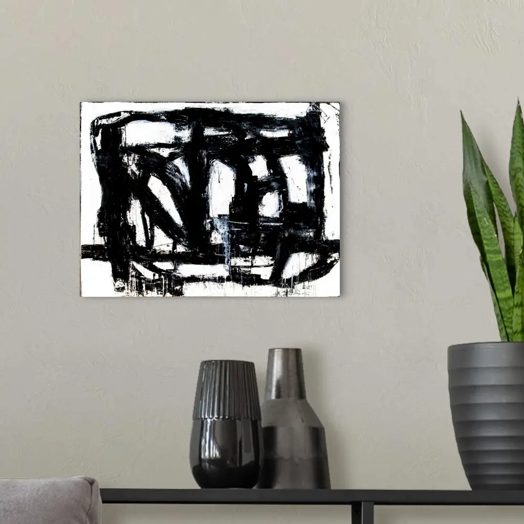 A black and white abstract painting of bold, black brush strokes going in different directions and overlapping.