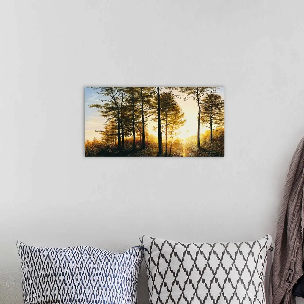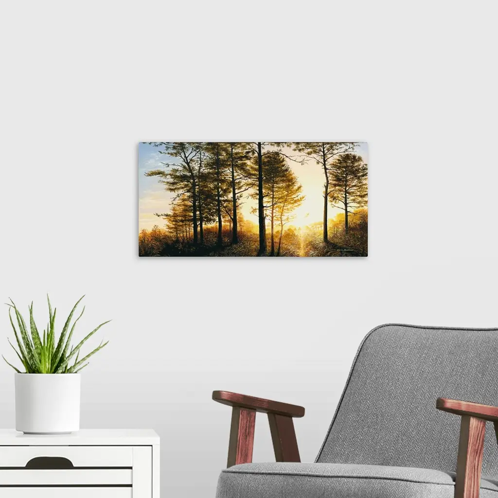 A painting of the woods with a bright yellow sunrise.