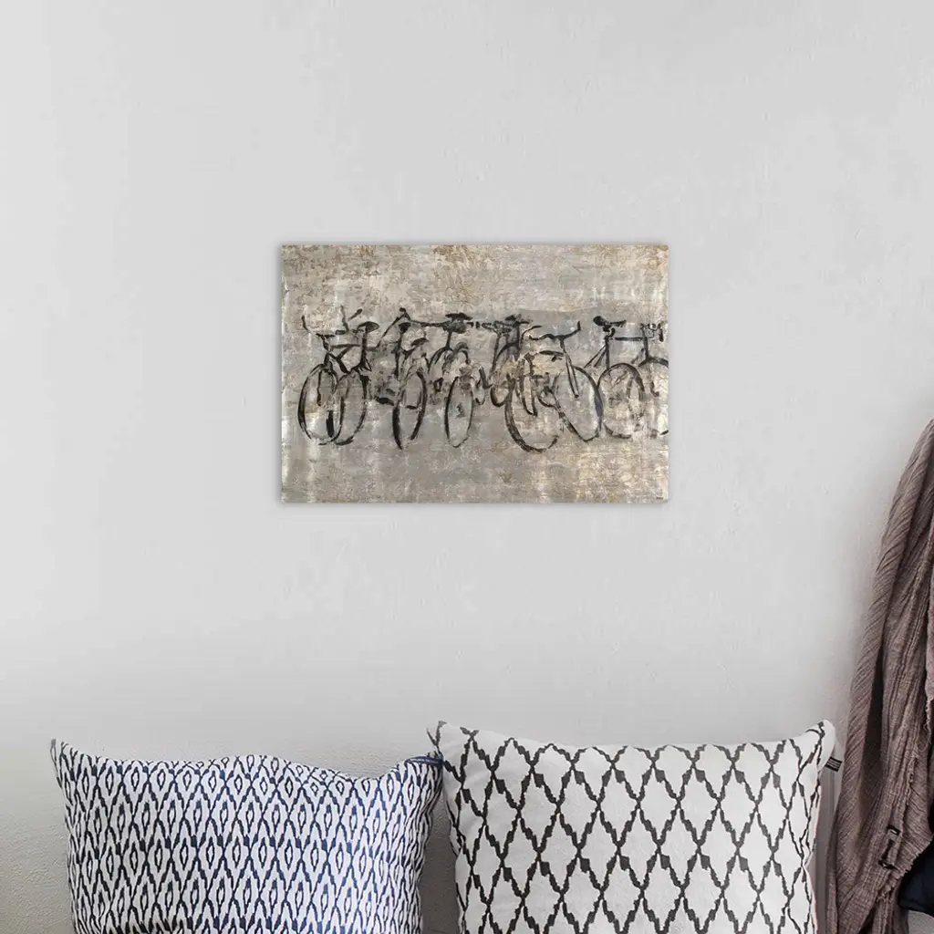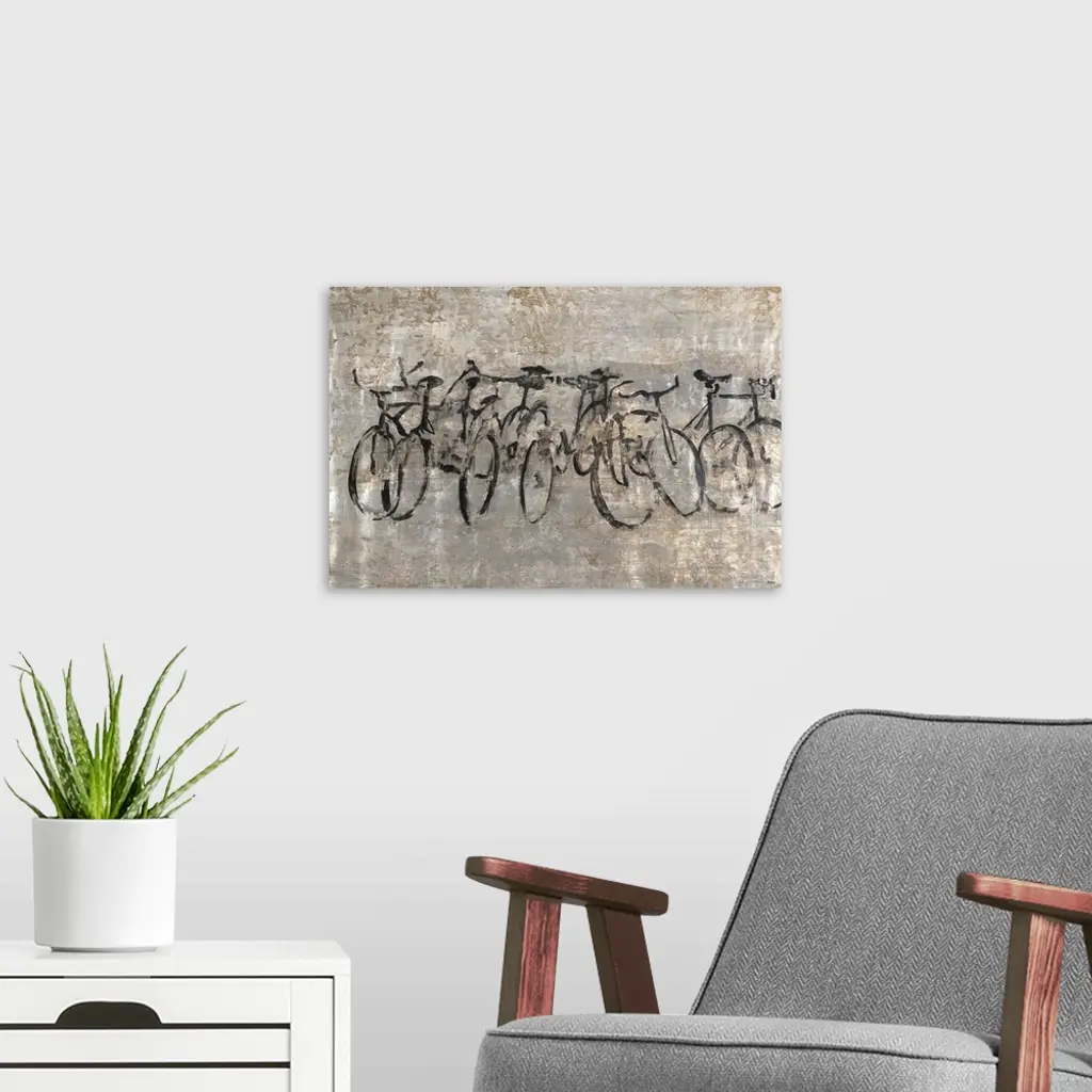 Contemporary painting of a row of bicycles on a textured grey background.