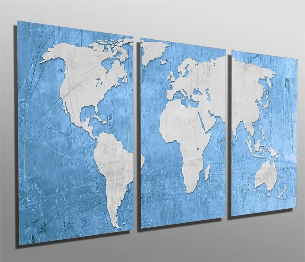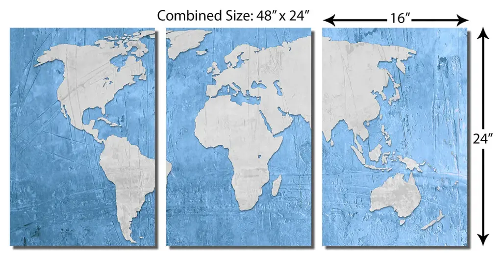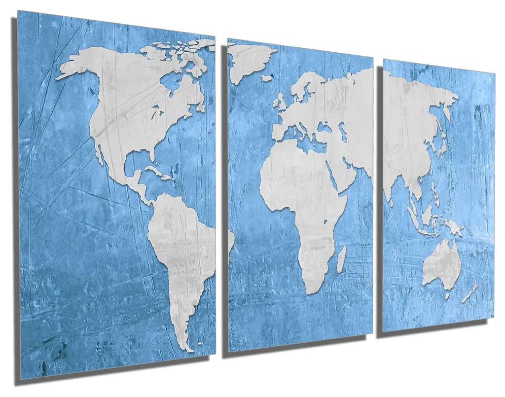 48"œ x 24"œ total size. Ready To Hang! (3 pieces - 16"œ x 24"œ each). 3 Panel Split (Triptych) World Map Metal Prints featuring light blue and silver colors. Modern metal wall art for home or office wall decor & interior design. Printed on Luxurious, HD aluminum glossy metal panels. Multi panel art.. HD aluminum panels. Metal print wall art. Includes Shadow Wall Mount on the back.• Aluminum Metal Wall Art• Made in USA• Ready to hang - No assembly required• Shadow mount hardware on the back• 0.045"œ thick HD Aluminum Panels• Scratch resistant, glossy finish• Superb color clarity, luxurious prints• Epson printing process• For indoor or moisture rich environment use• Easy to clean. Gently wipe with microfiber cloth.