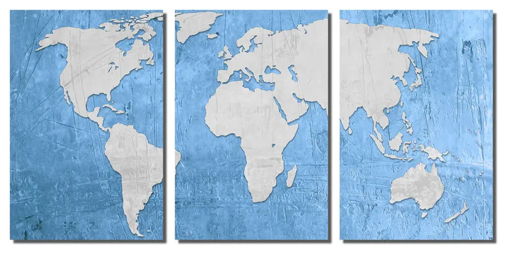 72"œ x 36"œ total size. Ready To Hang! (3 pieces - 24"œ x 36"œ each). 3 Panel Split (Triptych) World Map Metal Prints featuring light blue and silver colors. Modern metal wall art for home or office wall decor & interior design. Printed on Luxurious, HD aluminum glossy metal panels. Multi panel art.. HD aluminum panels. Metal print wall art. Includes Shadow Wall Mount on the back.• Aluminum Metal Wall Art• Made in USA• Ready to hang - No assembly required• Shadow mount hardware on the back• 0.045"œ thick HD Aluminum Panels• Scratch resistant, glossy finish• Superb color clarity, luxurious prints• Epson printing process• For indoor or moisture rich environment use• Easy to clean. Gently wipe with microfiber cloth.
