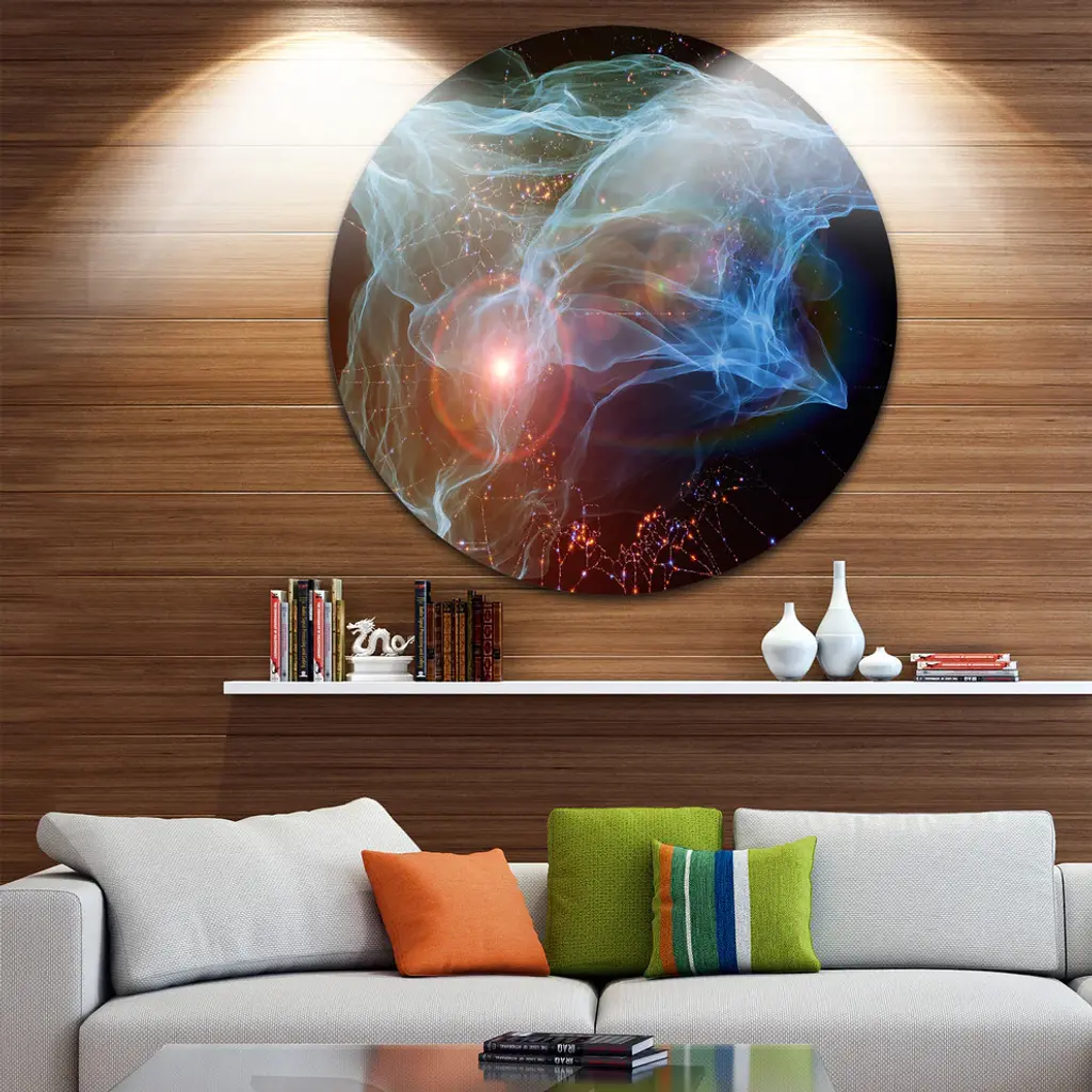 Bring Contemporary Abstraction to your home with this large Circle Metal wall art. This Light Blue Lights of Network Metal Artwork makes it the focal point of any room or office. - White Gloss Coating ensures colors are extra vibrant with light reflection.- Aluminum grade Sheet Metal with 1 inch mounting frame on the back giving the illusion that the artwork is floating on the wall..- Mounting Brackets are included along with instructions.- High Quality Digital images are created directly into a glossy aluminum panel producing a stunning and captivating print into the glossy finish of the metal.- Water, Fire and Scratch resistant HD Aluminum panels.- Looks better than any photo paper and guaranteed to last at least 20 years- Easy to clean with a microfiber cloth. Colors are far superior to regular Canvas Art. - Easy to Hang