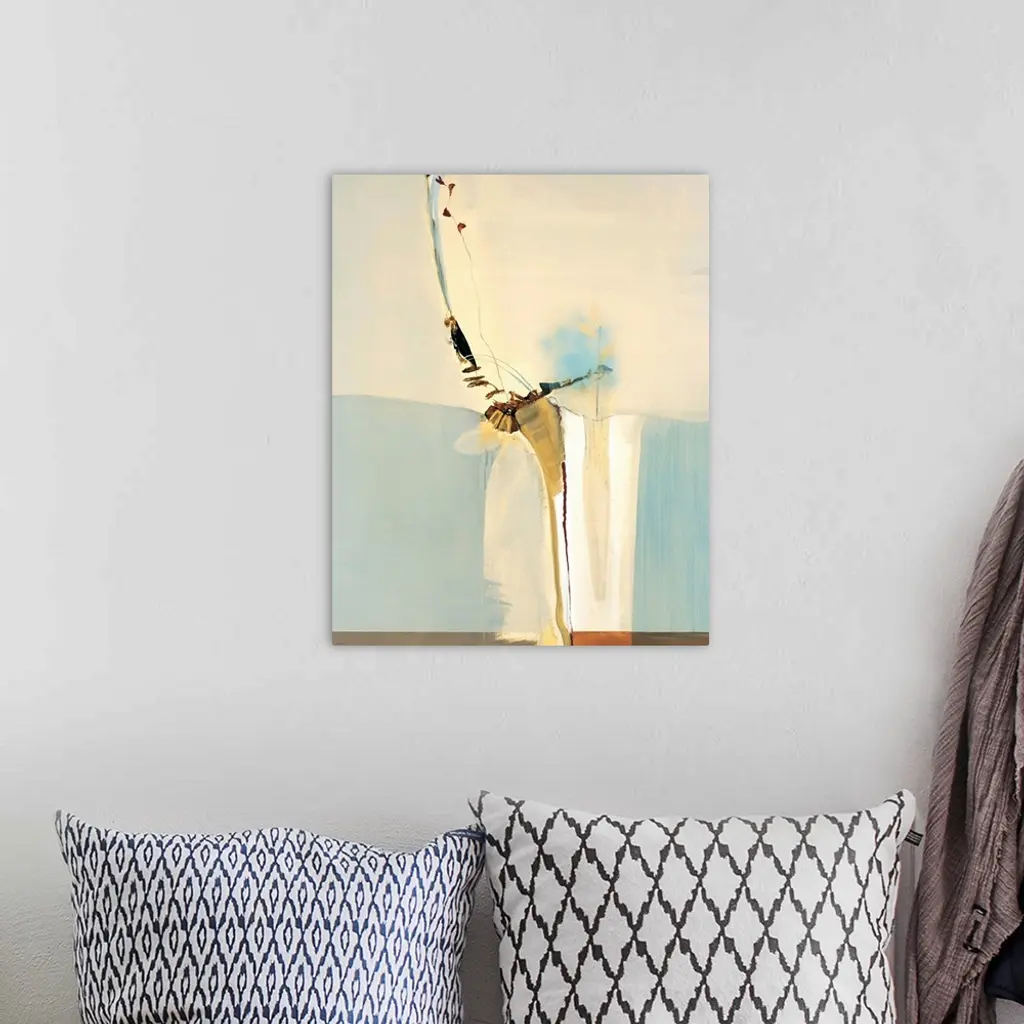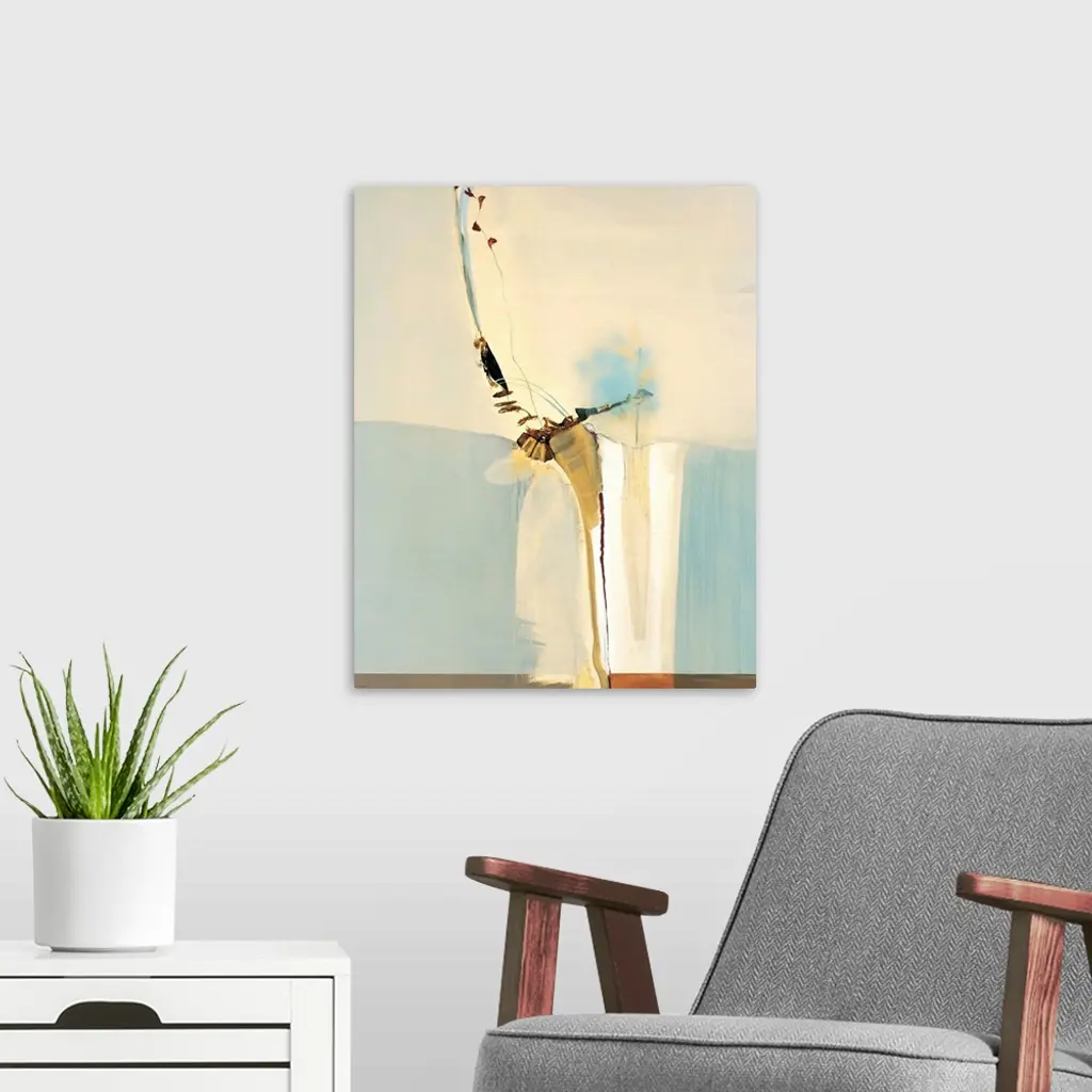 Contemporary abstract painting using pale gold and beige tones with sinuous like forms.
