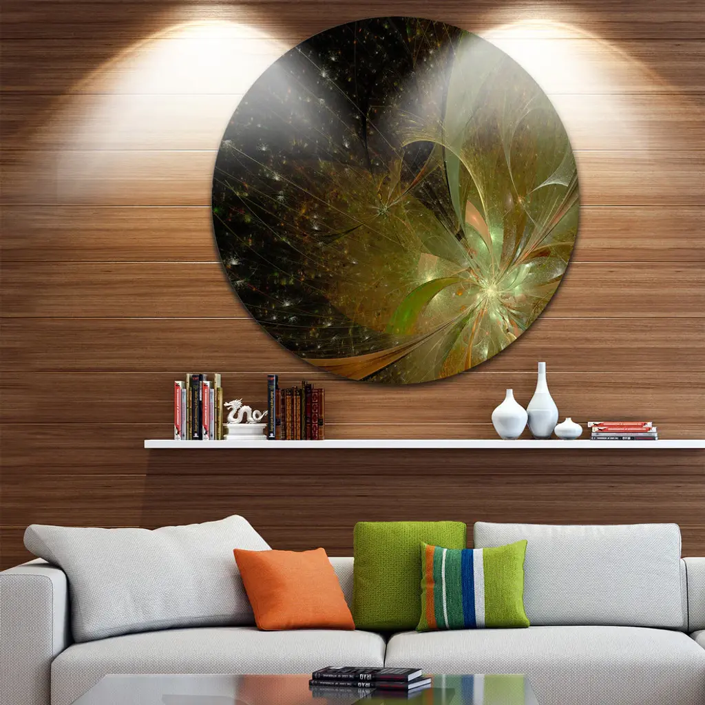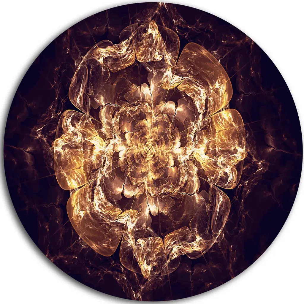 Bring Contemporary Abstraction to your home with this large Circle Metal wall art. This Light Golden Symmetrical Fractal Flower Metal Artwork makes it the focal point of any room or office. - White Gloss Coating ensures colors are extra vibrant with light reflection.- Aluminum grade Sheet Metal with 1 inch mounting frame on the back giving the illusion that the artwork is floating on the wall..- Mounting Brackets are included along with instructions.- High Quality Digital images are created directly into a glossy aluminum panel producing a stunning and captivating print into the glossy finish of the metal.- Water, Fire and Scratch resistant HD Aluminum panels.- Looks better than any photo paper and guaranteed to last at least 20 years- Easy to clean with a microfiber cloth. Colors are far superior to regular Canvas Art. - Easy to Hang
