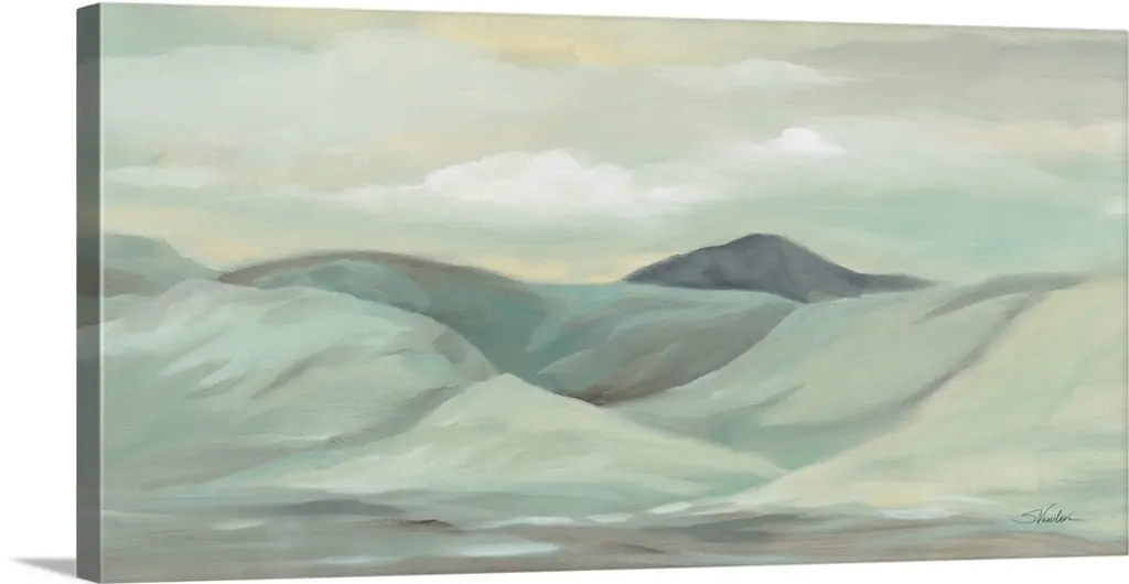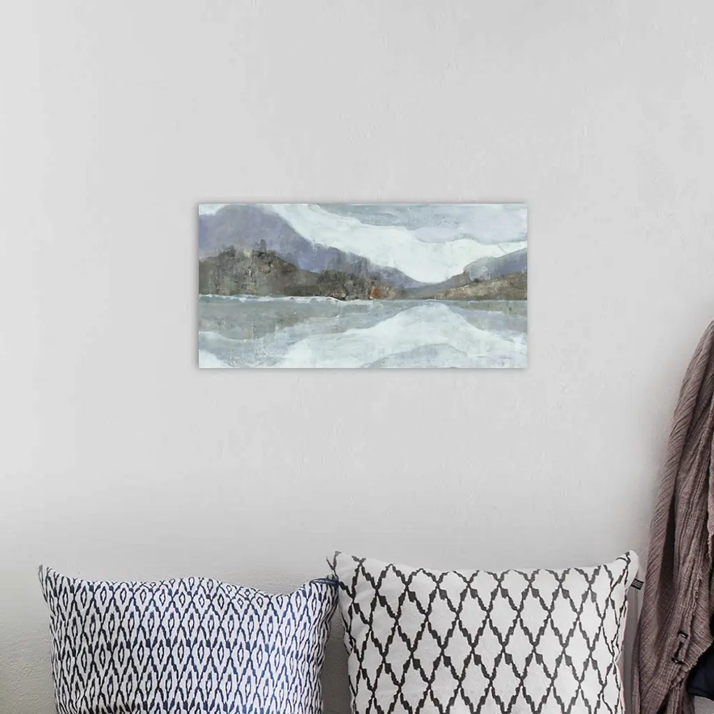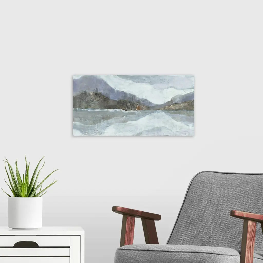 Abstract painting of a mountainous Winter landscape with a lake in the foreground, in cool tones.
