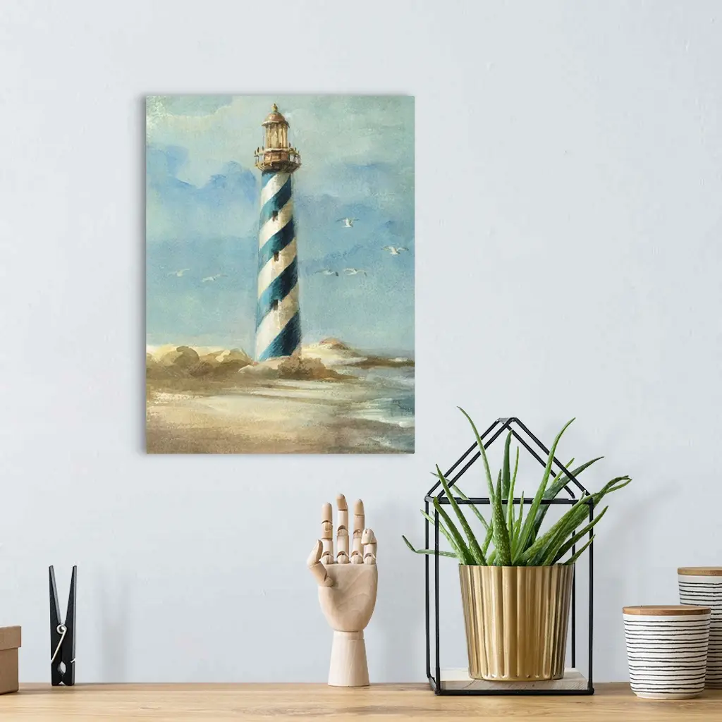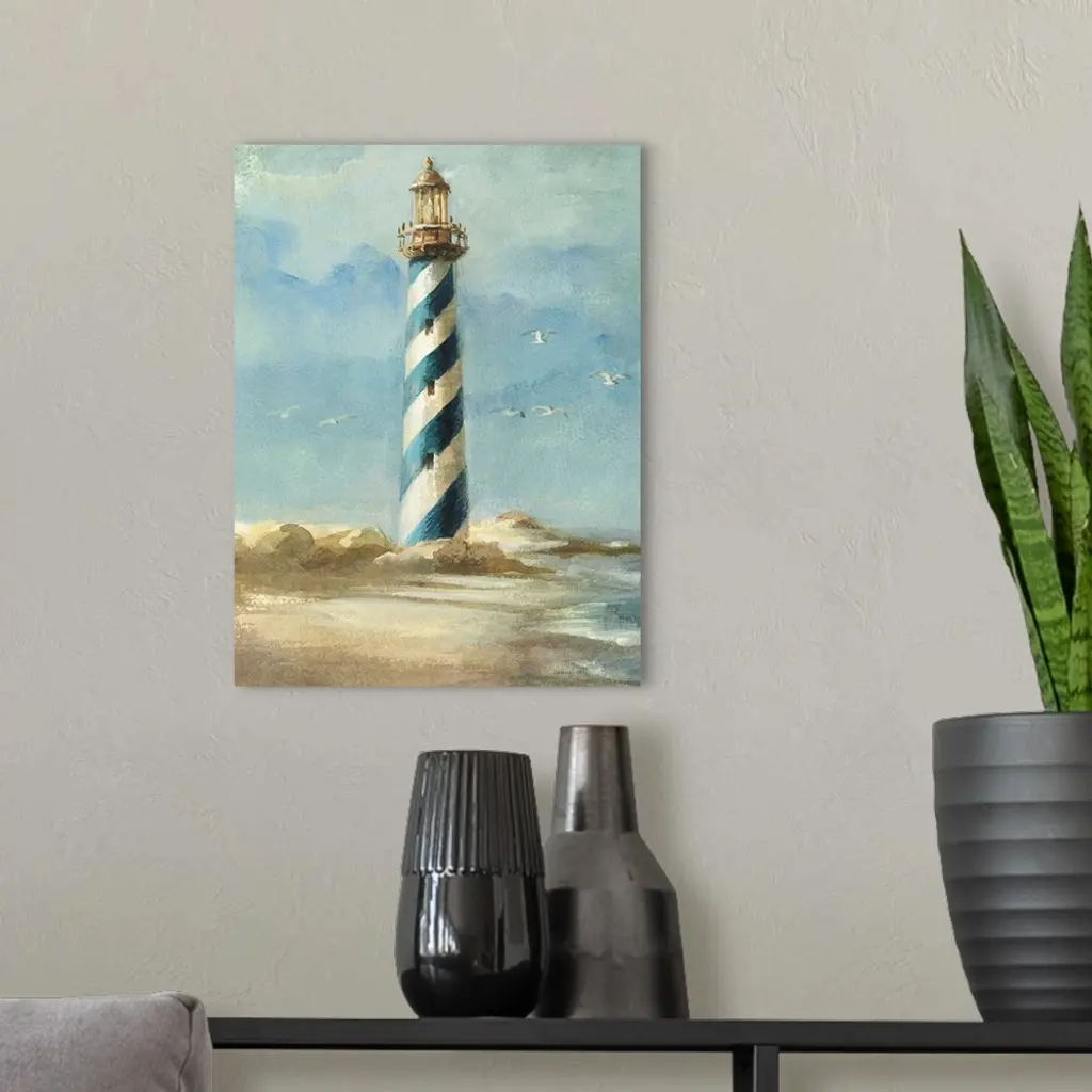 Contemporary painting of a blue spiral striped lighthouse in a coastal scene.
