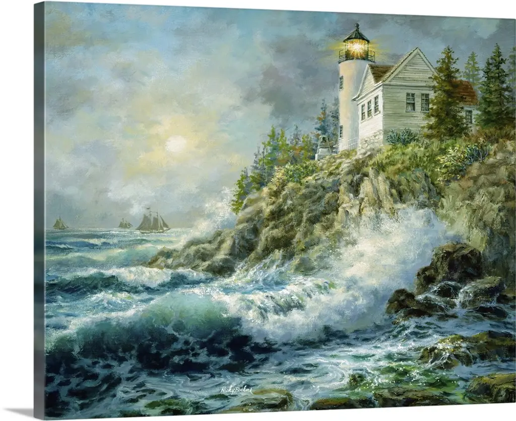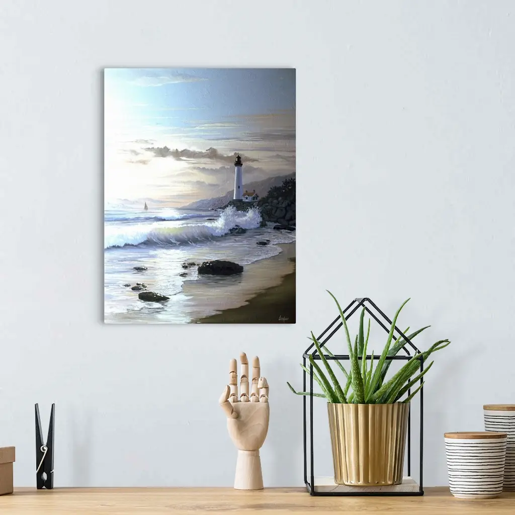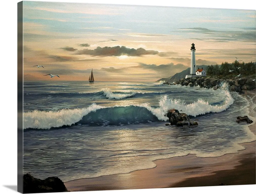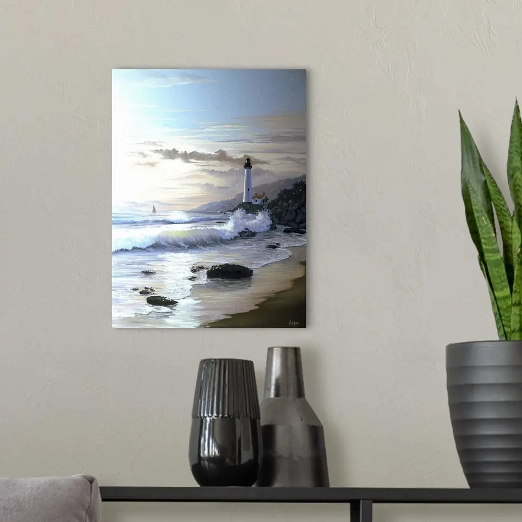 Contemporary painting of waves crashing on the coastline at twilight, with a lighthouse in the distance.