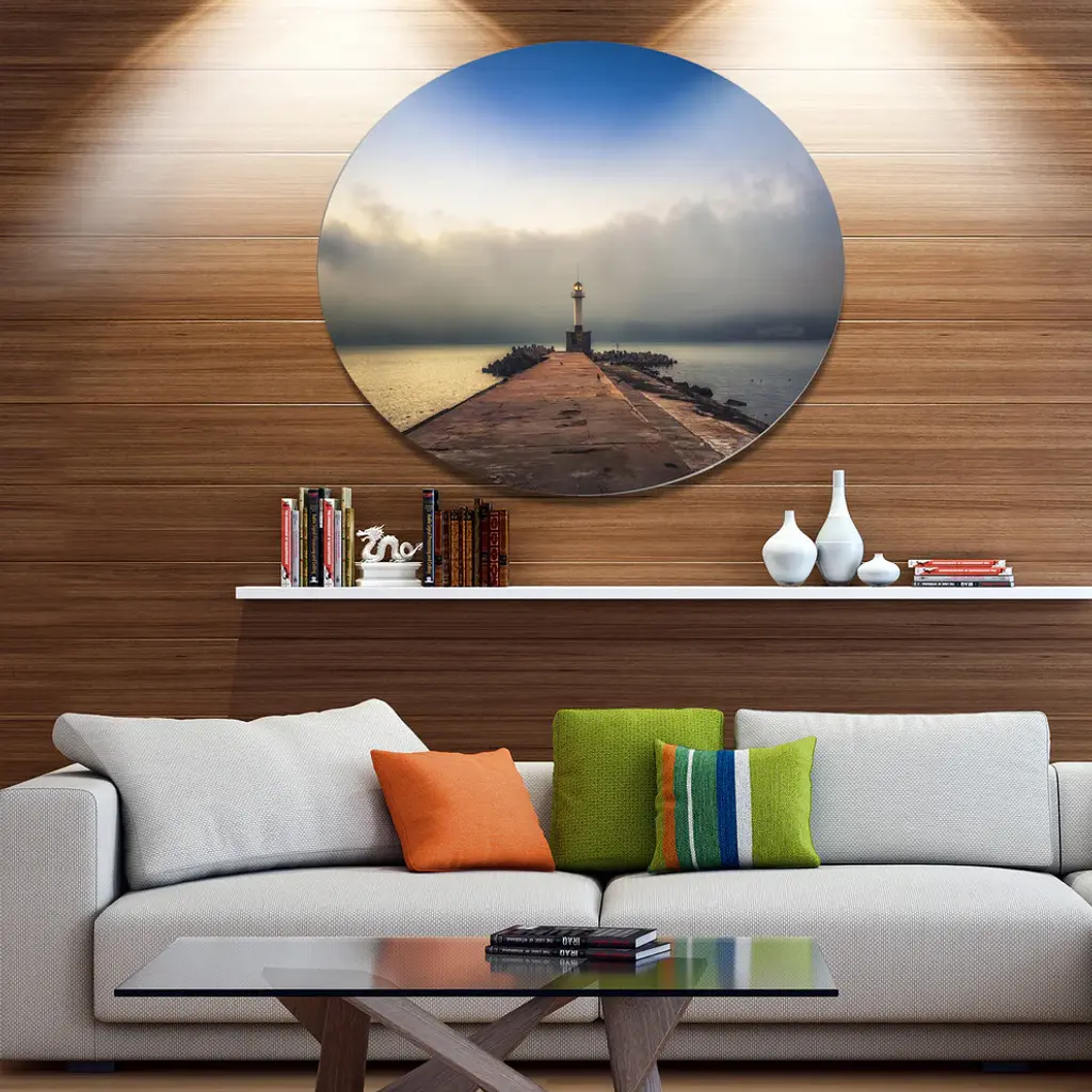 Bring Contemporary Abstraction to your home with this large Circle Metal wall art. This Lighthouse on Coast and Cloudy Sky Metal Artwork makes it the focal point of any room or office. - White Gloss Coating ensures colors are extra vibrant with light reflection.- Aluminum grade Sheet Metal with 1 inch mounting frame on the back giving the illusion that the artwork is floating on the wall..- Mounting Brackets are included along with instructions.- High Quality Digital images are created directly into a glossy aluminum panel producing a stunning and captivating print into the glossy finish of the metal.- Water, Fire and Scratch resistant HD Aluminum panels.- Looks better than any photo paper and guaranteed to last at least 20 years- Easy to clean with a microfiber cloth. Colors are far superior to regular Canvas Art. - Easy to Hang