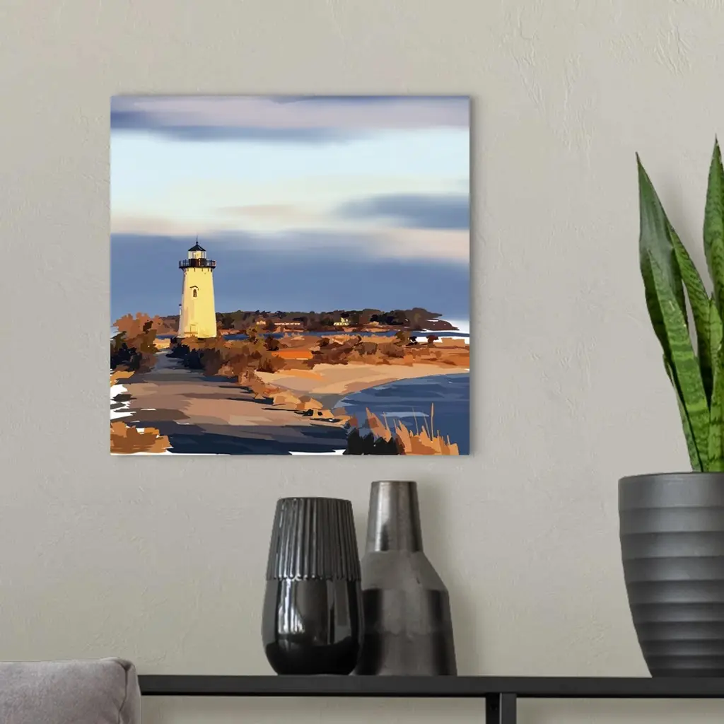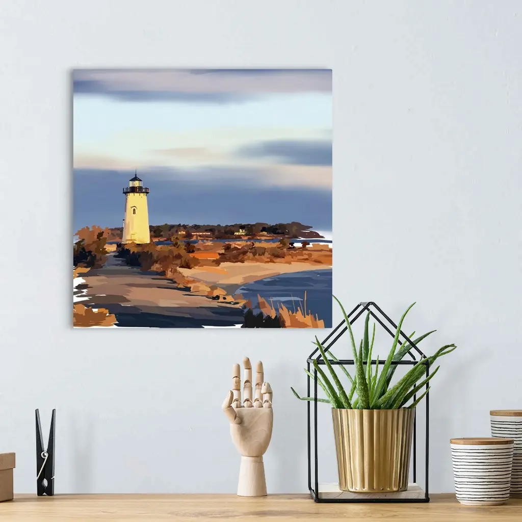Peaceful landscape painting of a lighthouse on the coast in the evening.