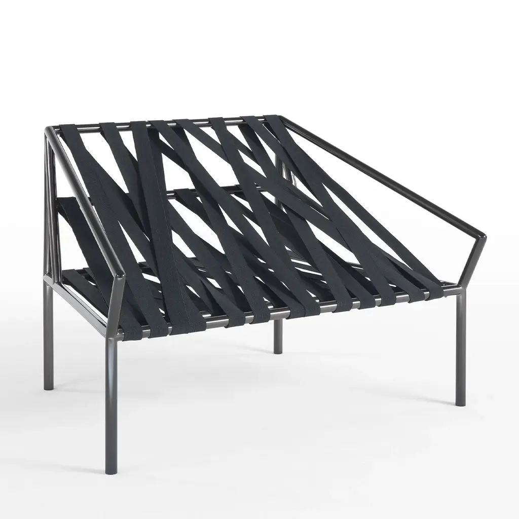"Ligomancer armchair shows what is normally hidden. More than one hundred meters of the elastic band, the type commonly used for the internal structure of cushioned furniture, is wrapped and woven around a fine tubular frame. The result is a conceptual artwork inviting us to experience a new dimension of relaxation." Armchair with metal structure in black chrome finishing. Seat made of black elastic webbing. Variation Details: Armchair with metal structure in glossy copper or black chrome finishing. Seat made of black elastic webbing.