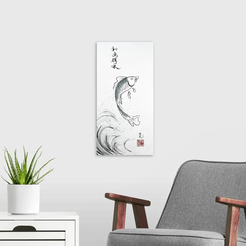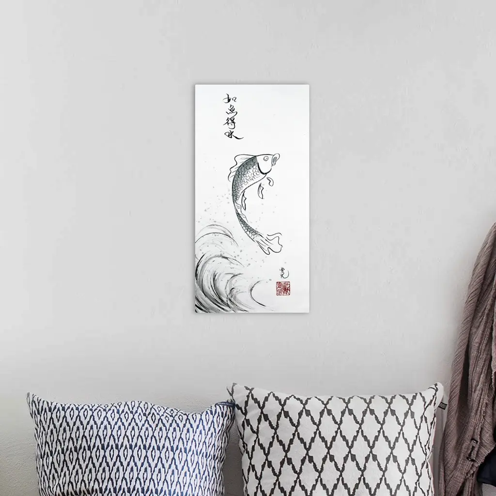 This Chinese ink painting is inspired by the Chinese saying, "Like A Fish With Water" (the 4 characters shown). In this world one can always flourish, given the right conditions or opportunities, just like fish with water.