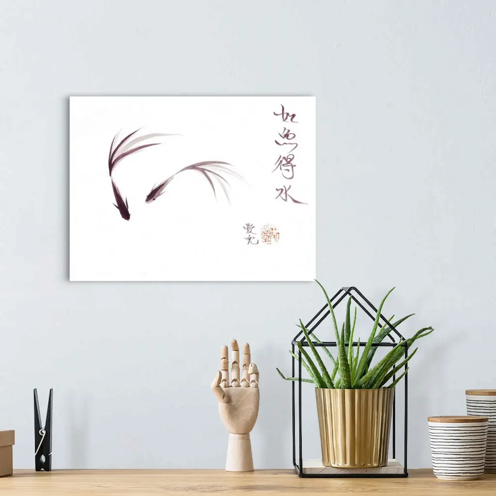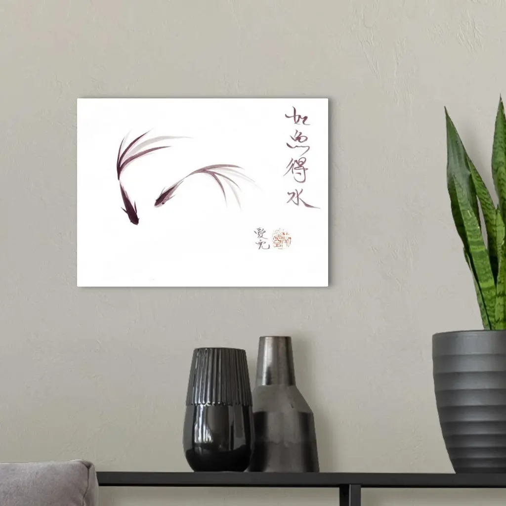 Ink and wash painting of two Betta fish. The 4 Chinese words on the right is the Chinese saying like fish with water. Given the right conditions, everybody can flourish...like fish with water.
