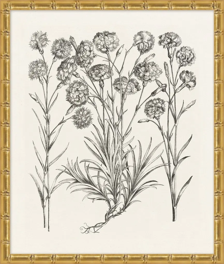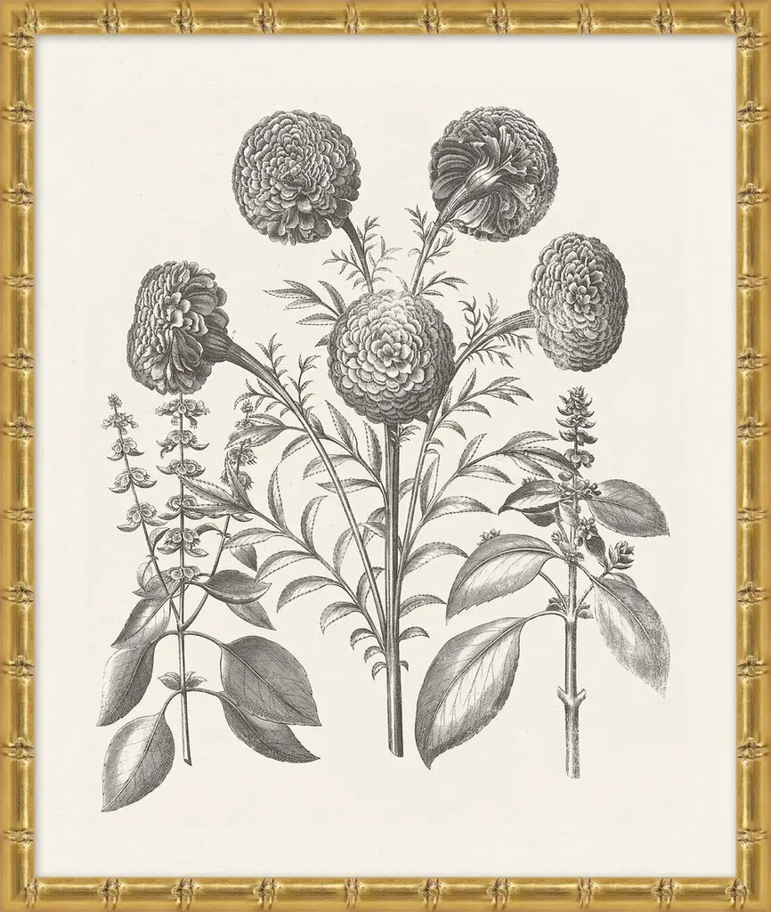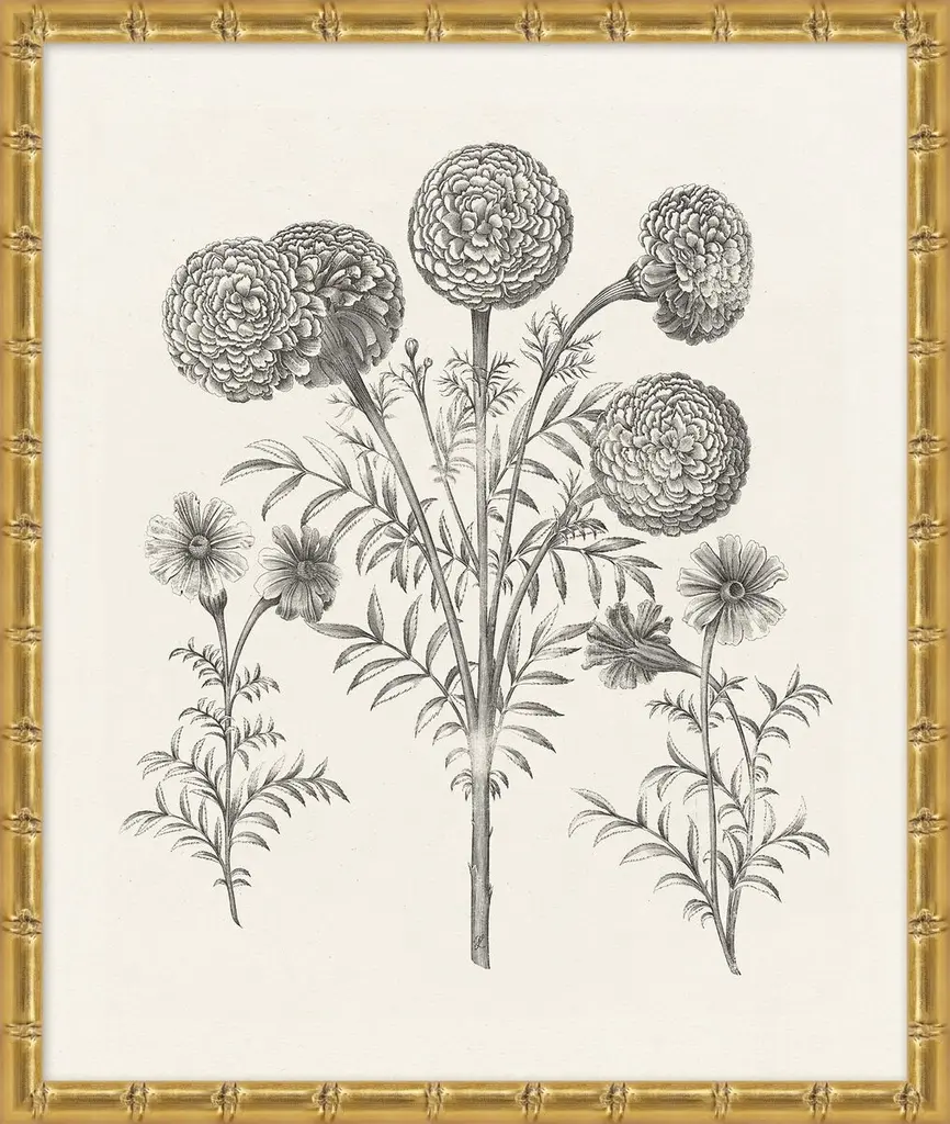 These reproductions of antique floral etchings are printed on high-quality matte paper and displayed in gilded bamboo-style frames. Part of the new art collection from design and home furnishings leader Lillian August, each piece arrives ready to hang.