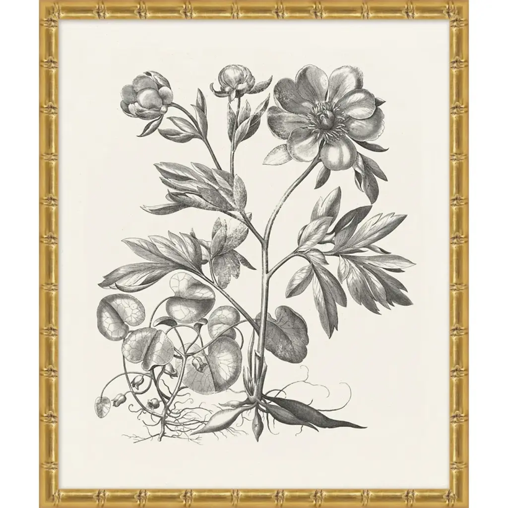 This reproduction of an antique floral etching is printed on high-quality matte paper and displayed in a gilded bamboo-style frame. Part of the new art collection from design and home furnishings leader Lillian August, this piece arrives ready to hang.