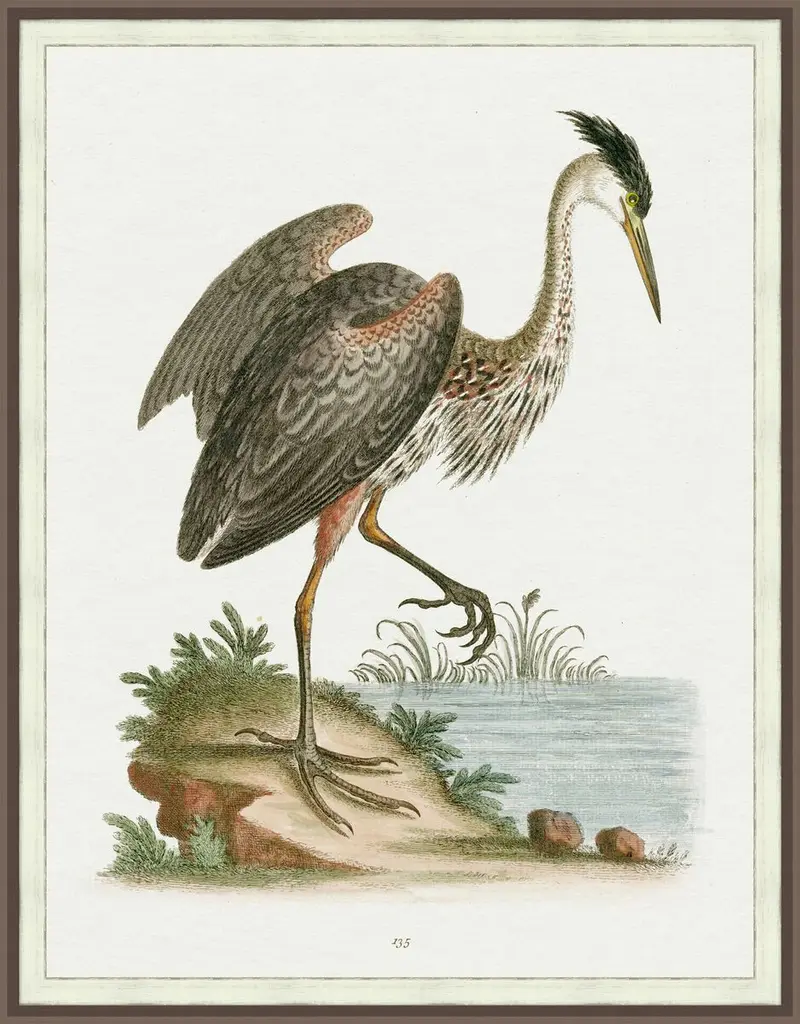 The painting depicts a graceful heron poised in tranquil waters, its elongated neck and delicate feathers rendered with exquisite detail, embodying both the serenity and elegance of nature. This is a giclee print on matte paper and arrives ready to hang.