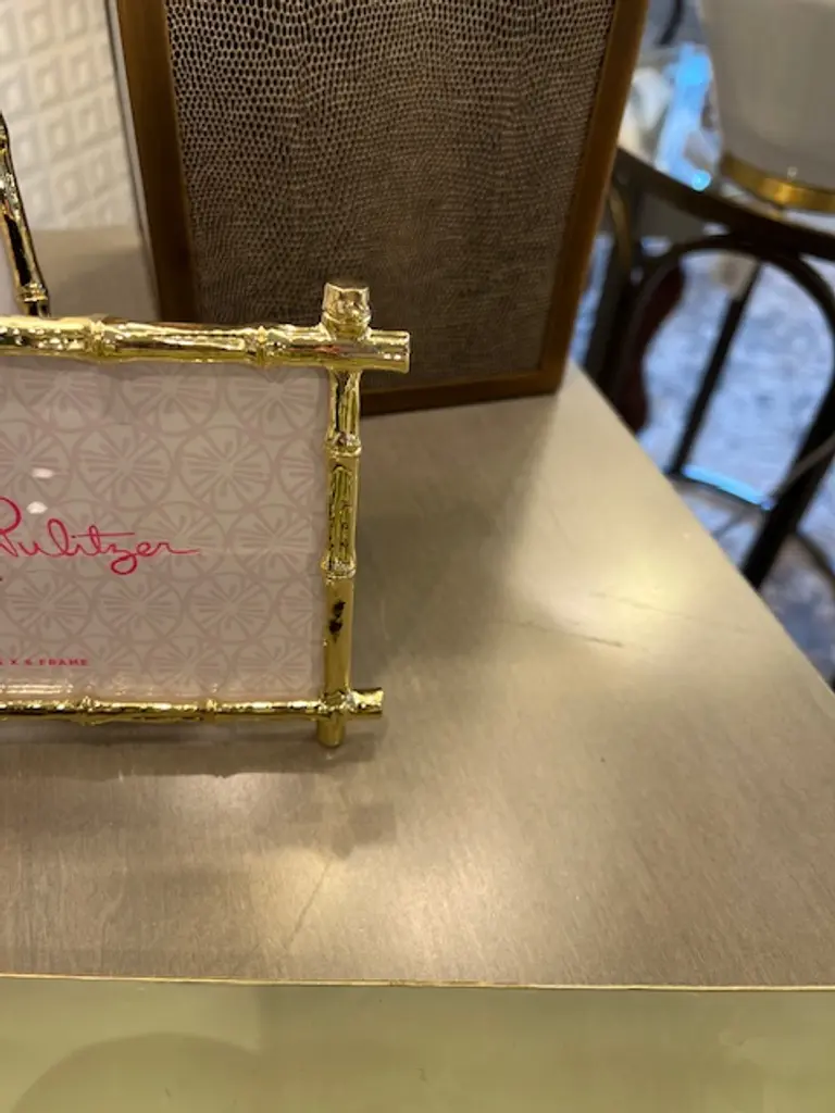 Go glam with this metal bamboo frame that's sized to showcase your favorite 4" x 6" photo. The easel stand paired with the luxe gold bamboo trim makes this decorative accent the perfect balance of ease and glamour. Coordinating additional frame here on our Chairish Shop Antique, vintage, designer floor samples & new products from one of the hottest Retail and To The Trade Home Furnishings showrooms in the country. Located in Chicago's chic Roscoe Village, Kenneth Ludwig Chicago carries the best offerings in furniture, accessories, artwork & textiles. Offerings are always fresh & always inspiring! Quite often ( due to a discontinued style, fabric or frame ) they must sell off their showroom floor samples. You receive first quality pieces at amazing prices. Check back weekly for new inventory added.
