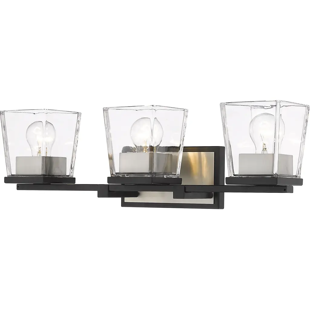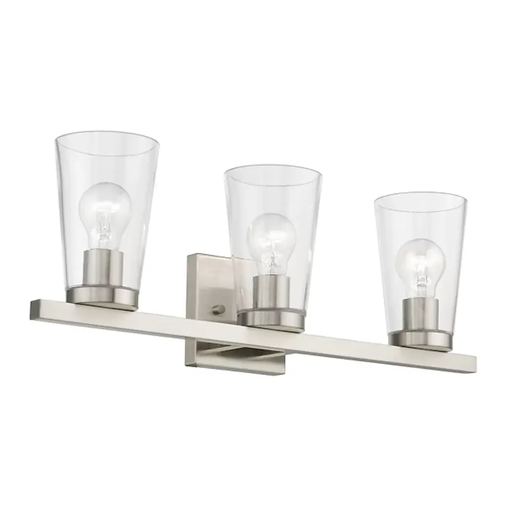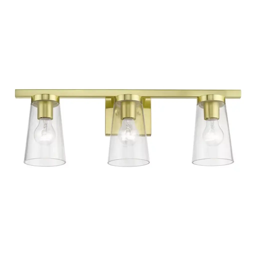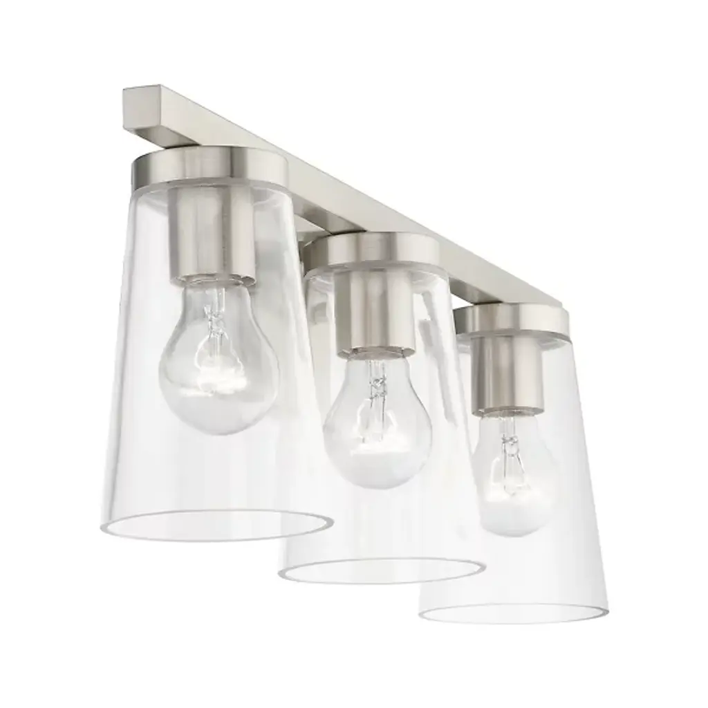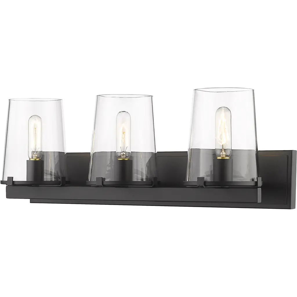 Present a timeless tasteful appeal to interiors with the Lily Vanity Light from Alder & Ore. A square wall plate secures the fixture, while the exposed lamping emerges from a horizontal crossbar suspended across it. It is escorted by flared clear glass shades and a refined finish to make a perfect match that can be oriented upward for indirect light or downward for direct downlight.