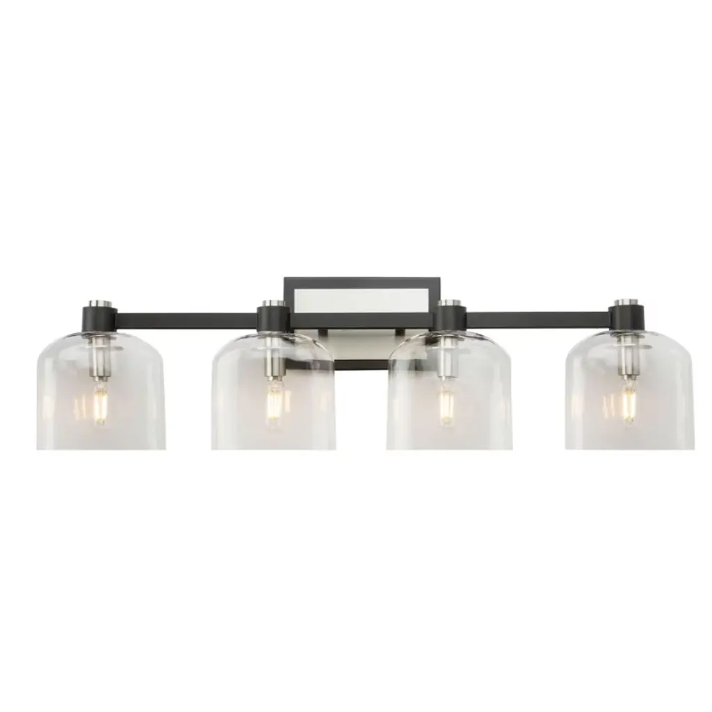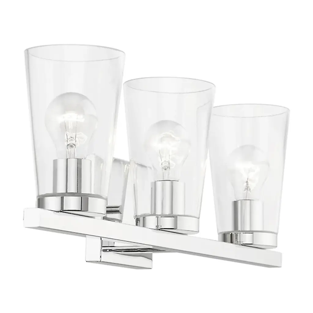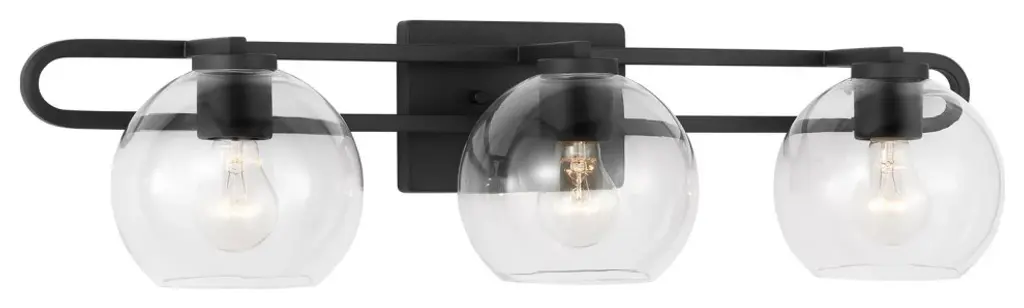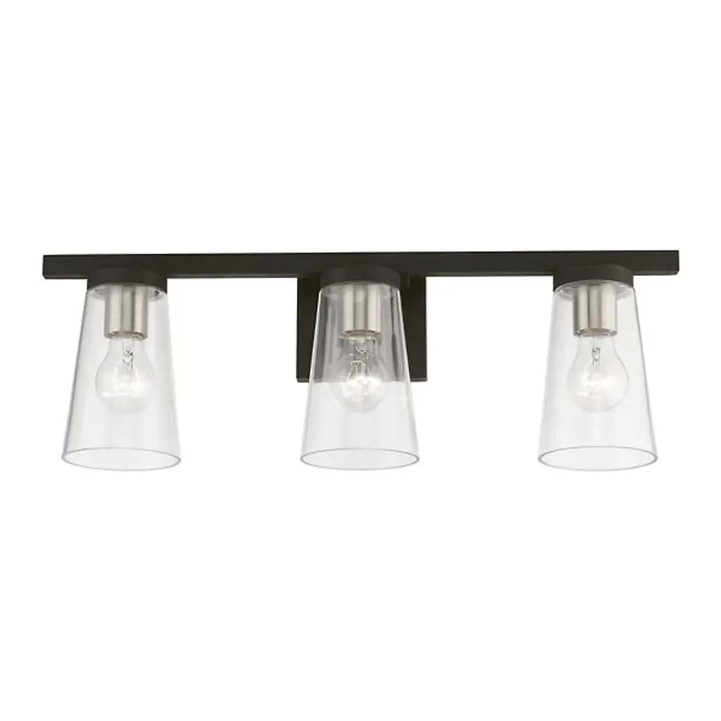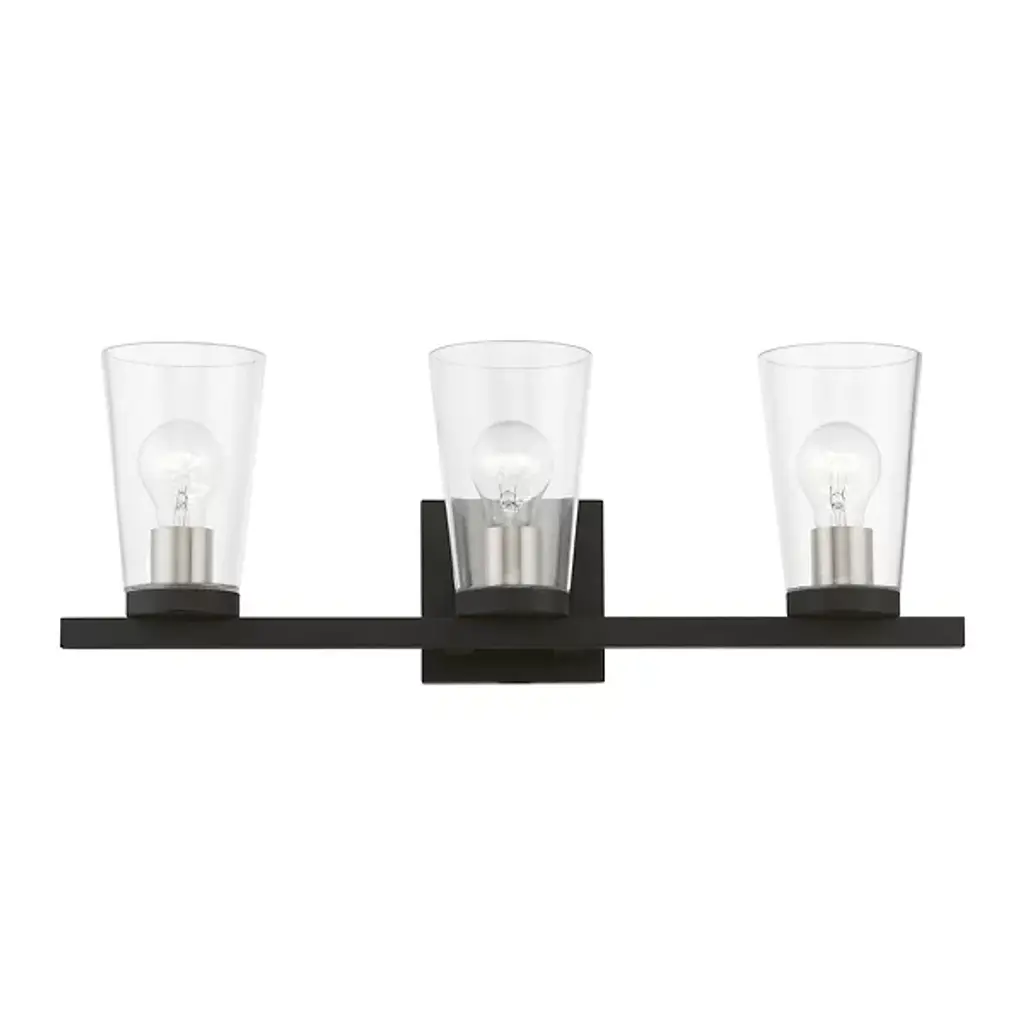 Present a timeless tasteful appeal to interiors with the Lily Vanity Light from Alder & Ore. A square wall plate secures the fixture, while the exposed lamping emerges from a horizontal crossbar suspended across it. It is escorted by flared clear glass shades and a refined finish to make a perfect match that can be oriented upward for indirect light or downward for direct downlight.