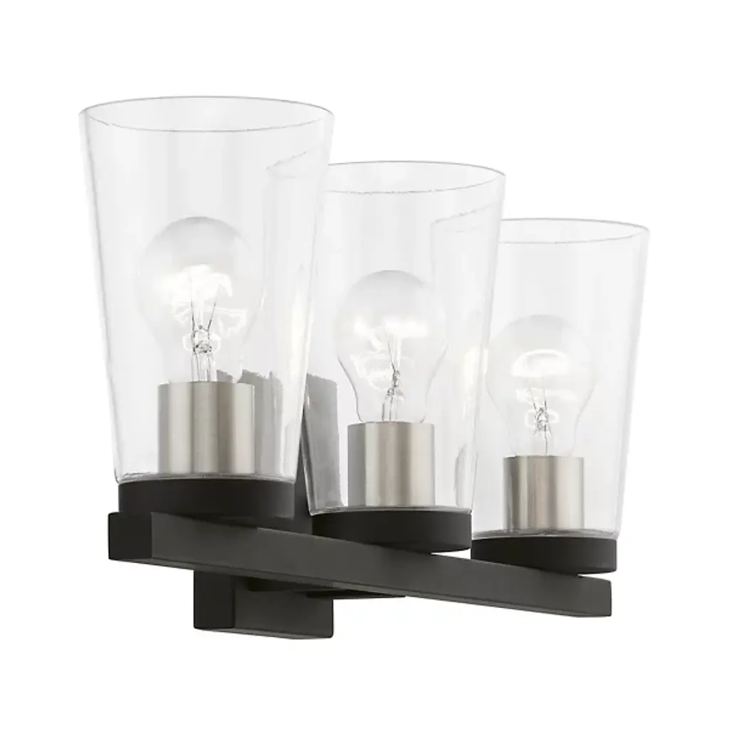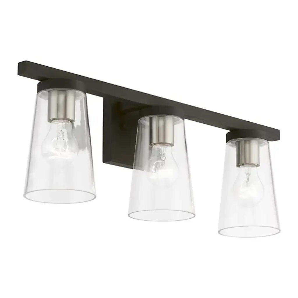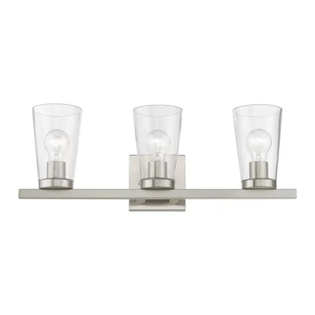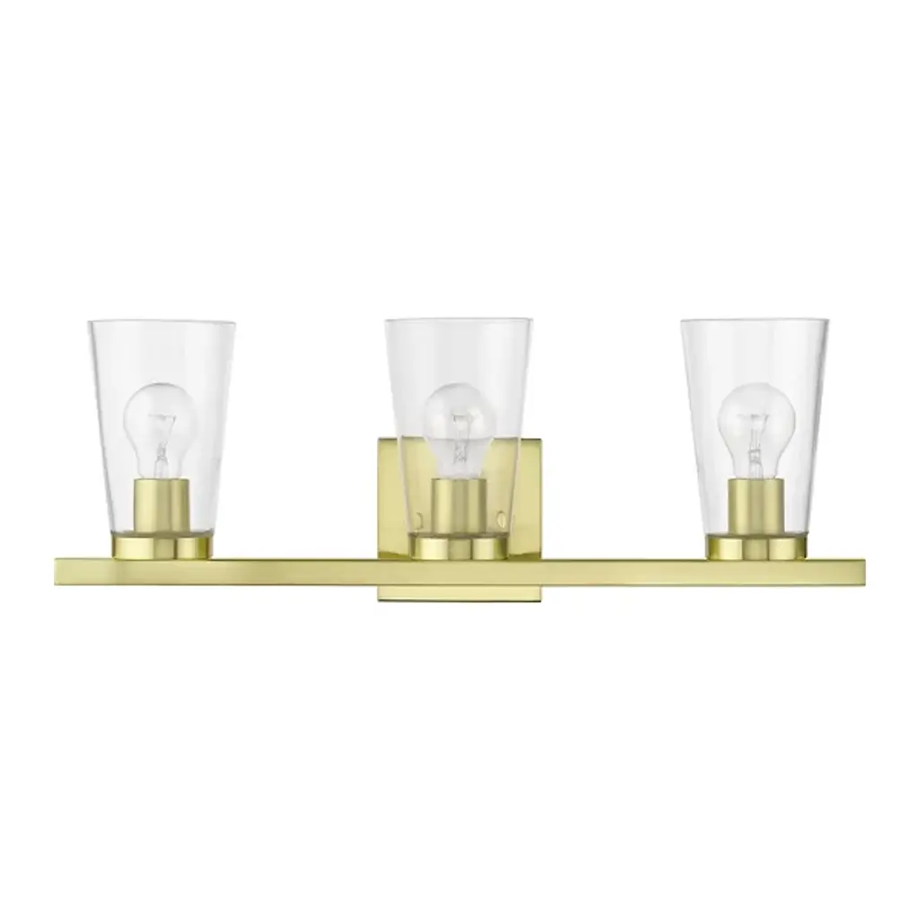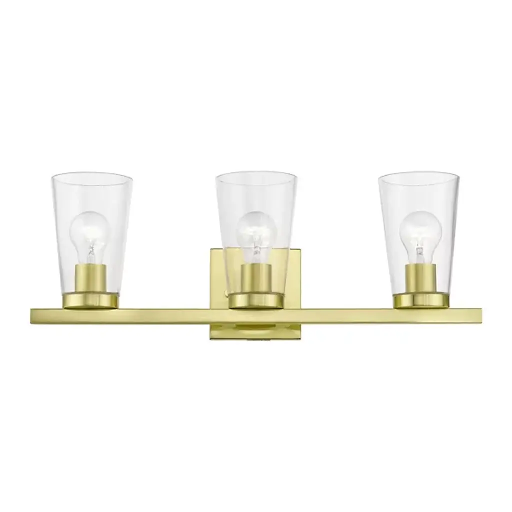 Present a timeless tasteful appeal to interiors with the Lily Vanity Light from Alder & Ore. A square wall plate secures the fixture, while the exposed lamping emerges from a horizontal crossbar suspended across it. It is escorted by flared clear glass shades and a refined finish to make a perfect match that can be oriented upward for indirect light or downward for direct downlight.