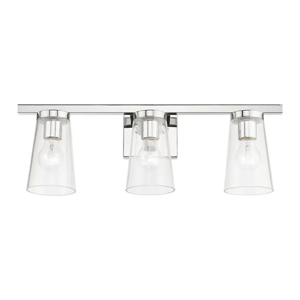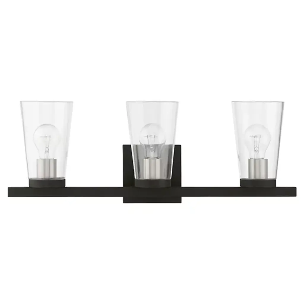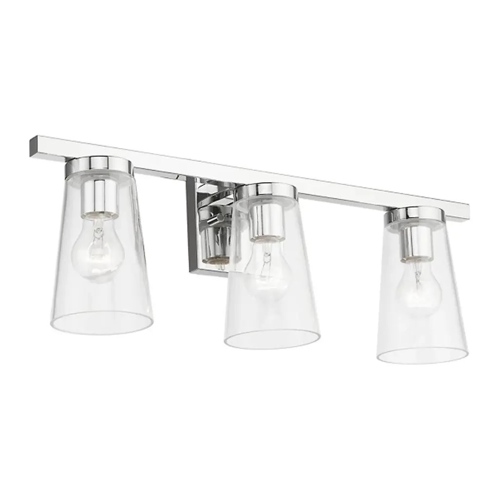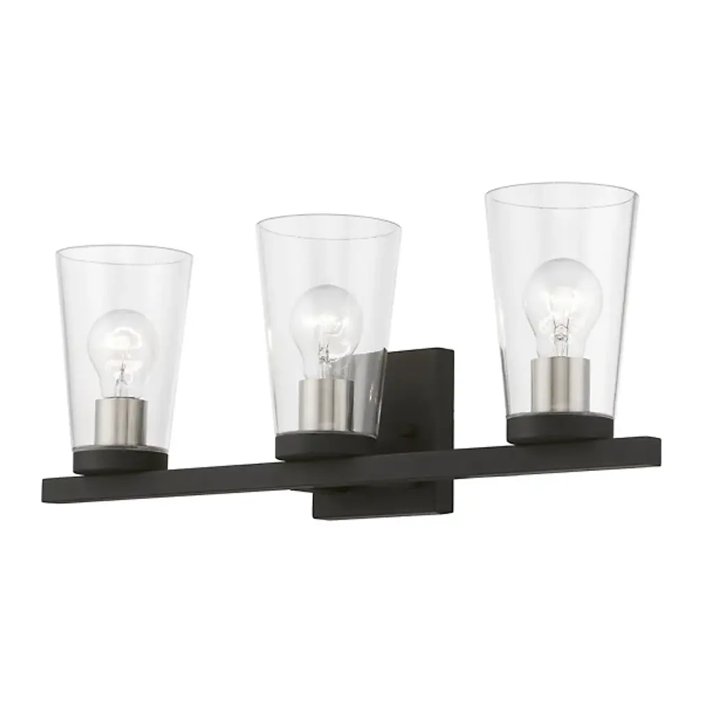 Present a timeless tasteful appeal to interiors with the Lily Vanity Light from Alder & Ore. A square wall plate secures the fixture, while the exposed lamping emerges from a horizontal crossbar suspended across it. It is escorted by flared clear glass shades and a refined finish to make a perfect match that can be oriented upward for indirect light or downward for direct downlight.