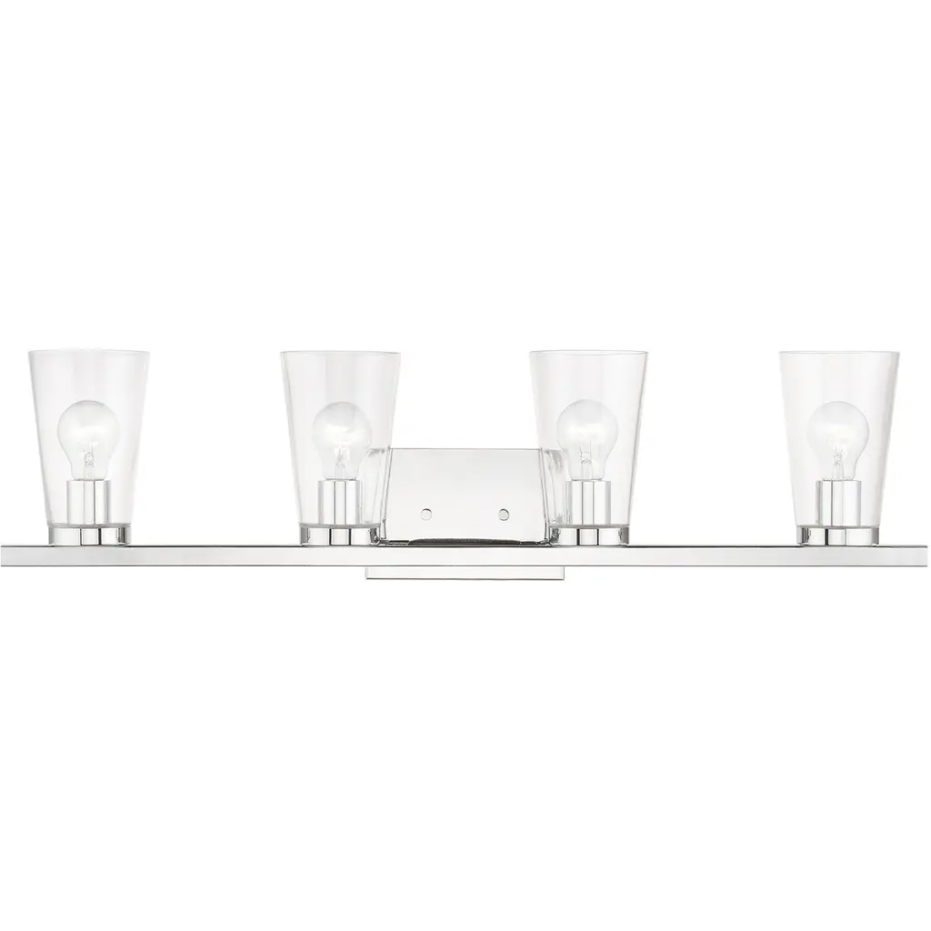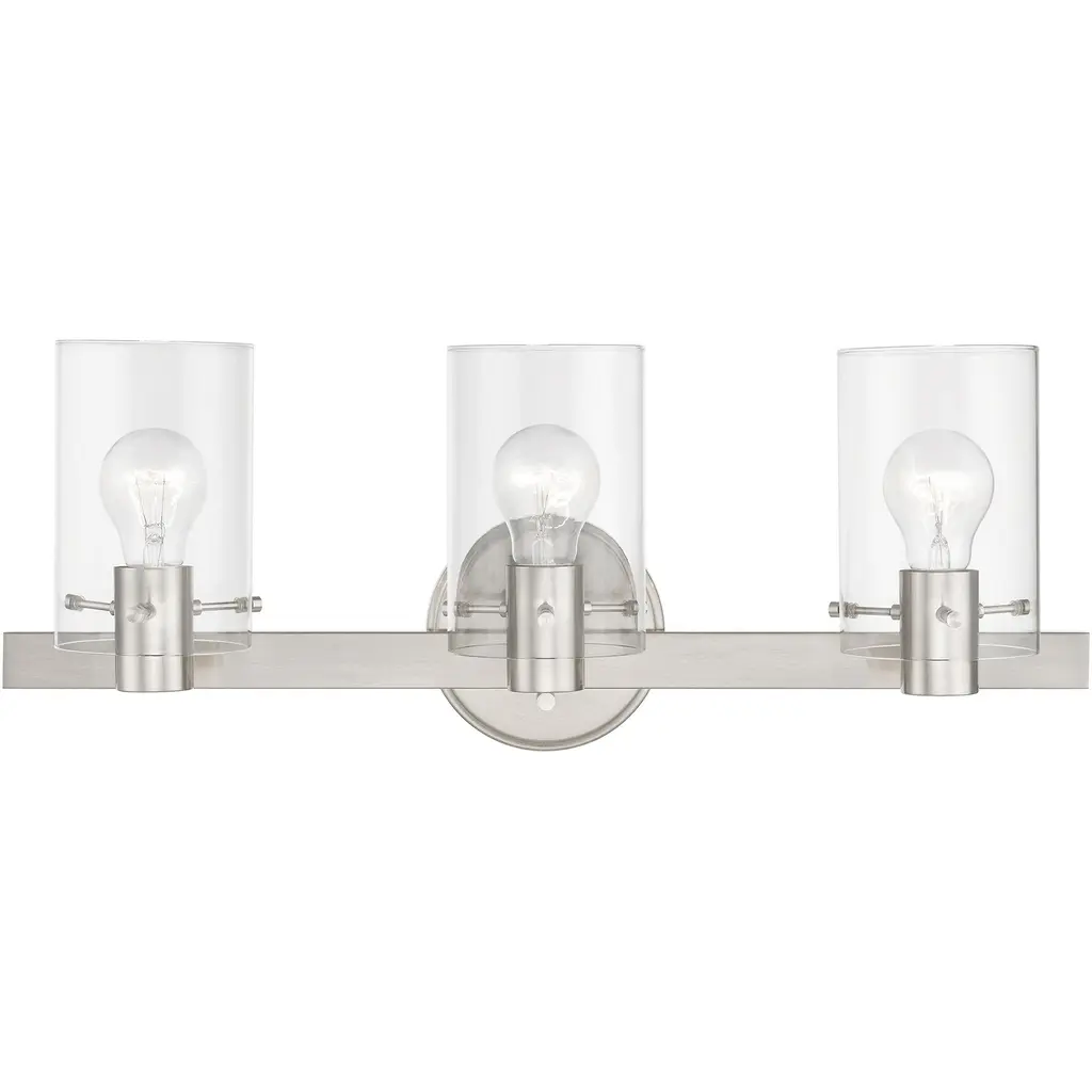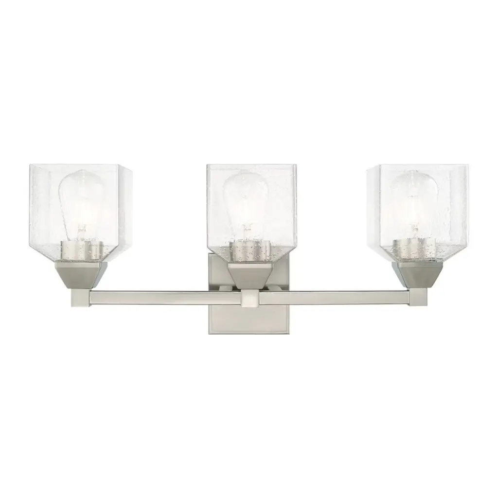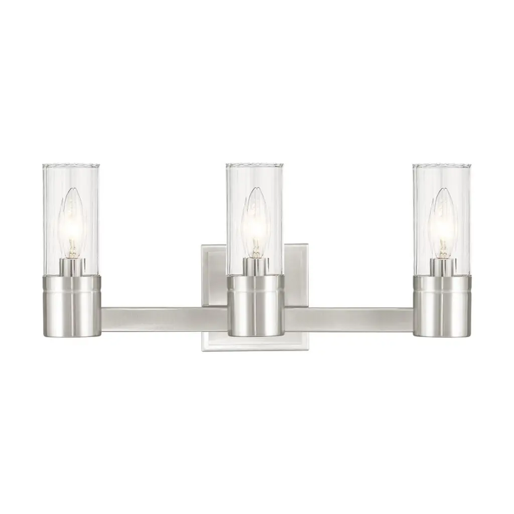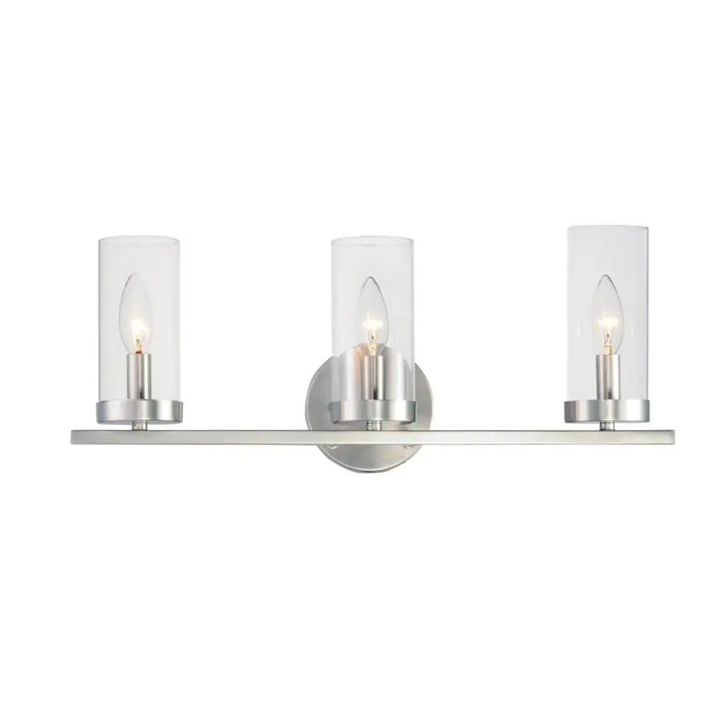 Present a timeless tasteful appeal to interiors with the Lily Vanity Light from Alder & Ore. A square wall plate secures the fixture, while the exposed lamping emerges from a horizontal crossbar suspended across it. It is escorted by flared clear glass shades and a refined finish to make a perfect match that can be oriented upward for indirect light or downward for direct downlight.