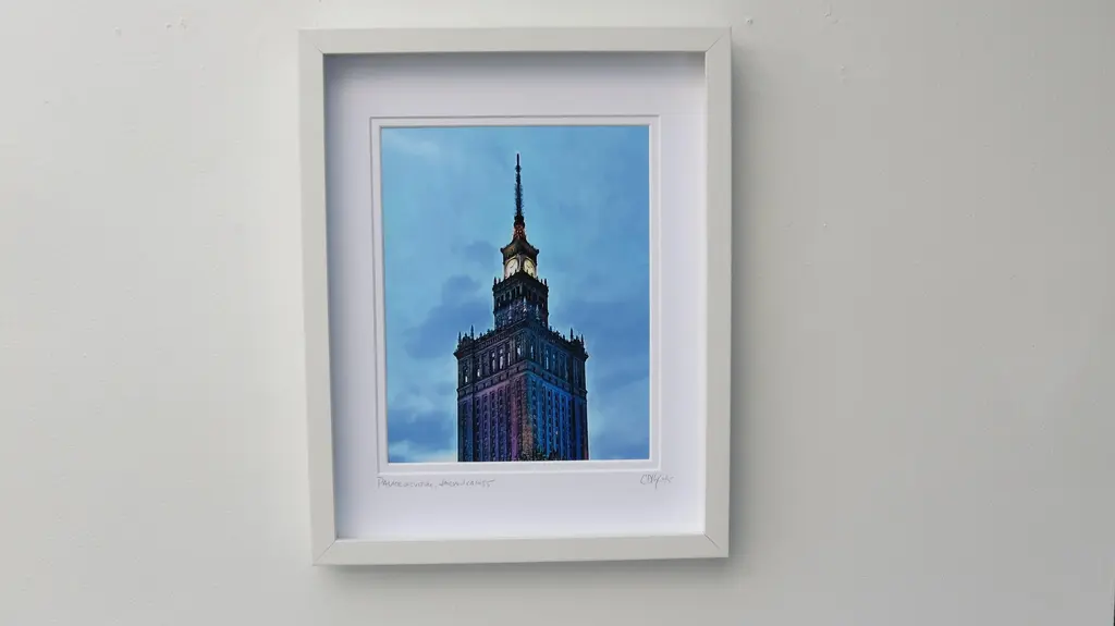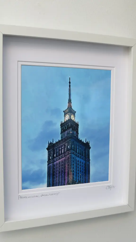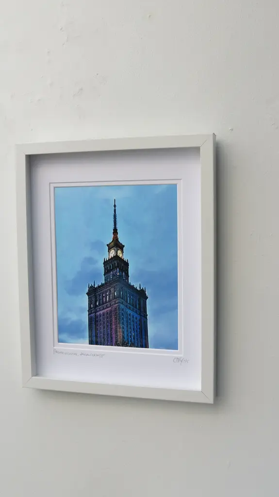 The Palace of Culture and Science. Warsaw, Ca. 1955. Unbelievably rich colors in this framed Limited Edition digital photo.. White modern frame with double matted size at 11 x 14. Print size is 8" x 10". Overall size of frame is 12" x 15" x 1.25" d. Signed dated and numbered edition. Hanging hardware included. UV glass and archival material for years of image stabilization even in direct sunlight.