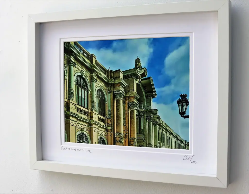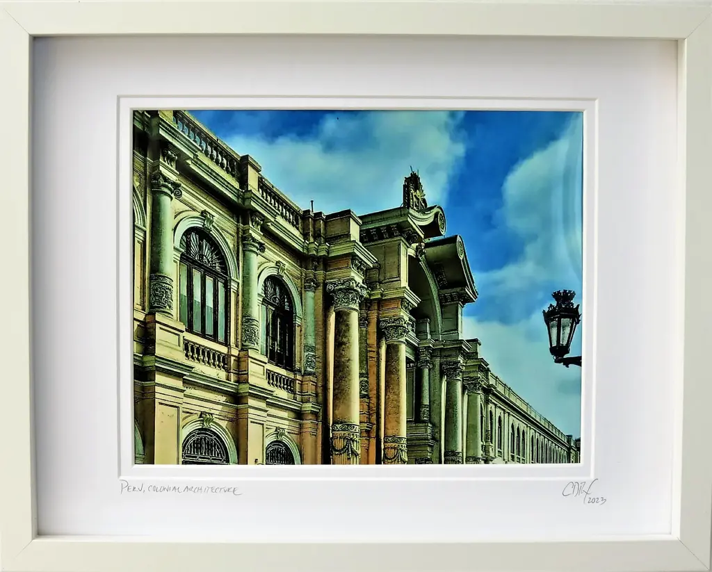Lima, Peru. Limestone Colonial Facades. Brilliant architectural travel photography adds a dramatic visual effect with digitally enhanced color framed and matted under glass. 12" x 15". Size matted at 11" x 14", image is 10" x 14". Signed/ dated. White modern frame with backing and hanging hardware attached.