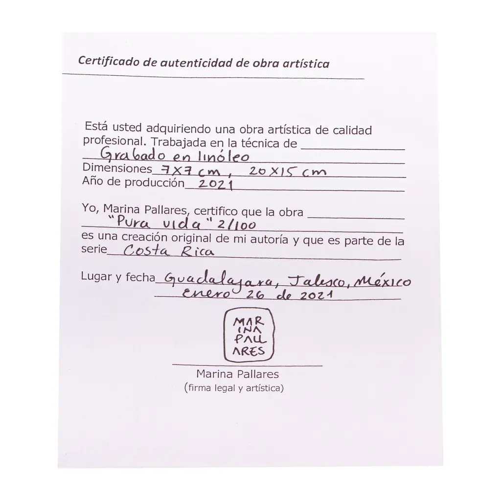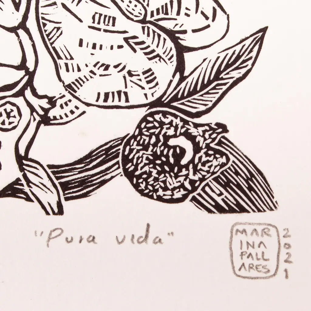 Working in the time-honored art form of linoleum block printing, artist Marina Pallares creates this beautiful limited-edition print. Titled Pura Vida, the print is from the artist's 'Costa Rica' series. The artist was inspired by the country's magnificent flora and fauna in creating the artwork.