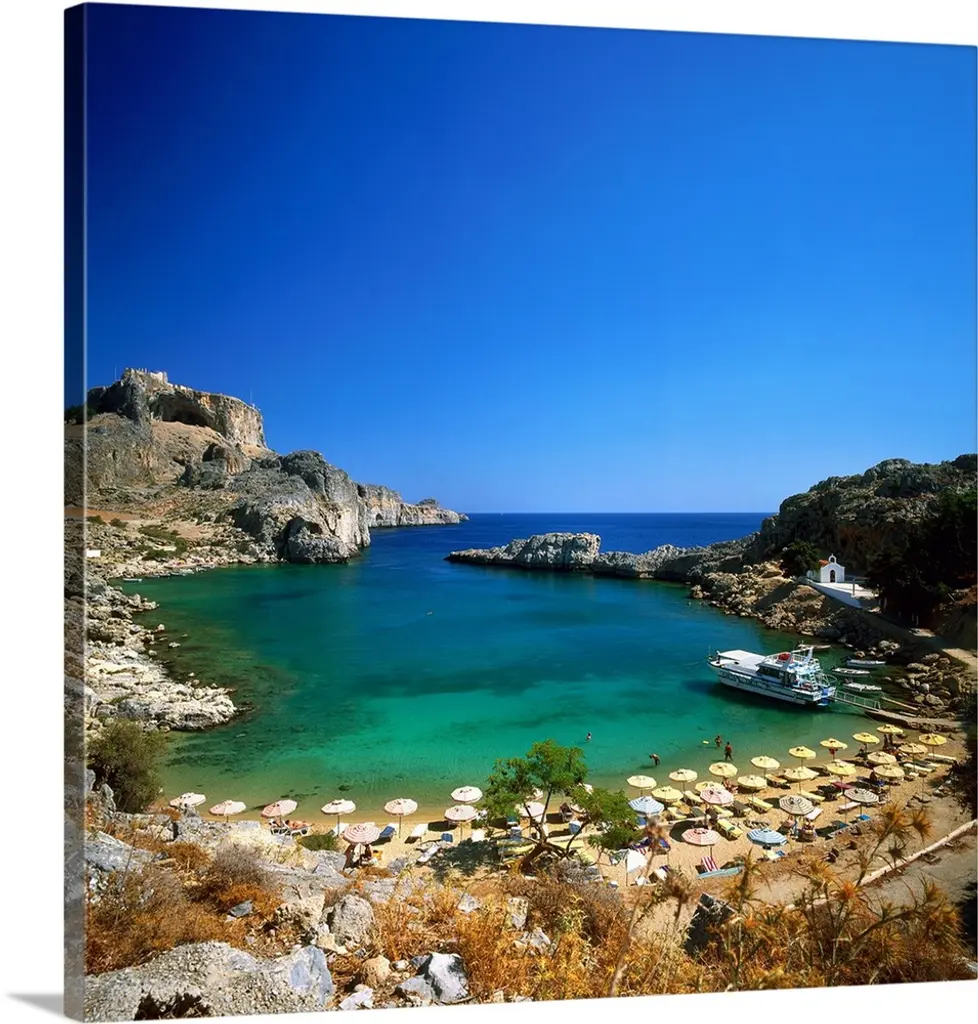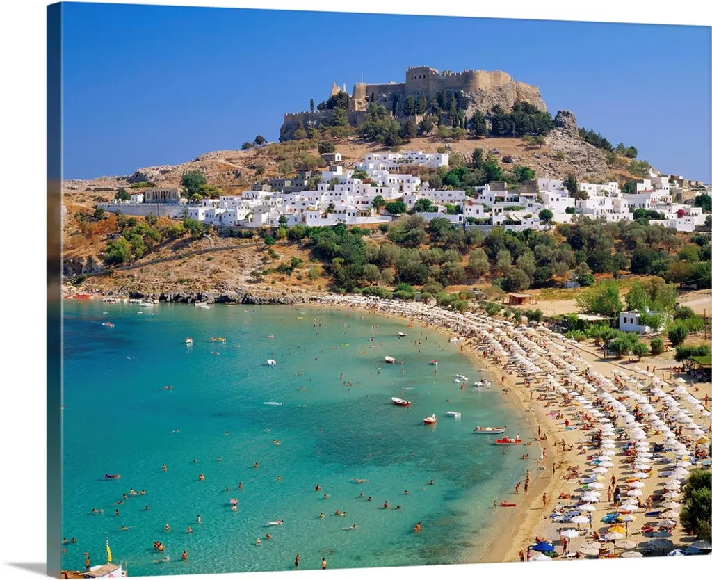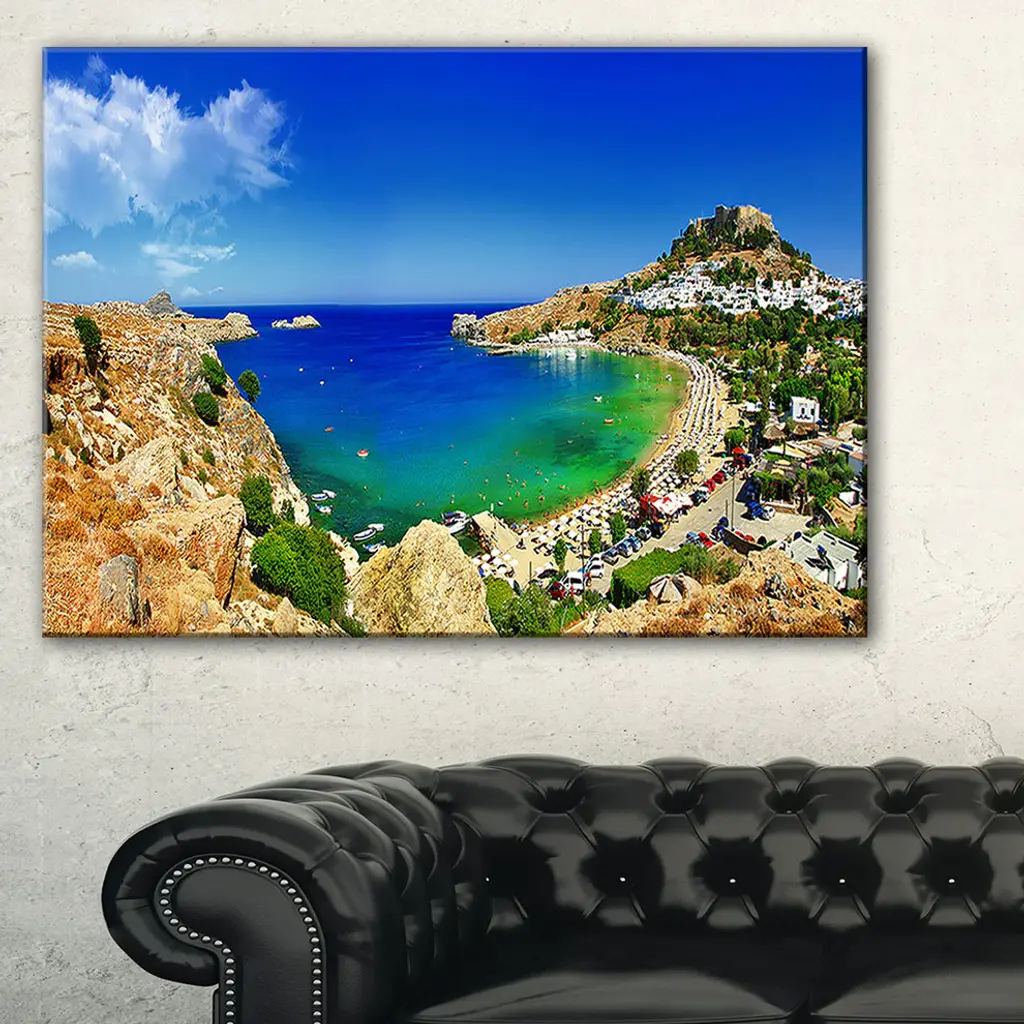 The Lindos Bay Greece Panorama canvas art print is sure to make an impression on anyone who sees it. This artwork is gallery wrapped around a 1-inch solid wood frame and arrives carefully packaged and entirely ready to hang on the wall. Design Art only uses the highest resolution and pigments to ensure a crisp colorful print that is never faded or pixelated. This artwork is sure to be a conversation starter in any home or office.