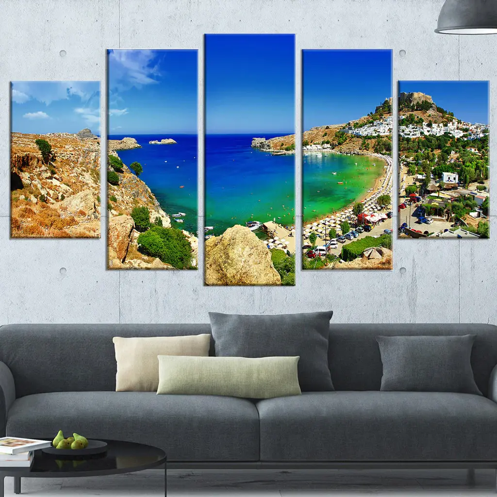 "Lindos Bay, Greece" Panorama Landscape Canvas Photo Print, 5 Panels, 60"x32"