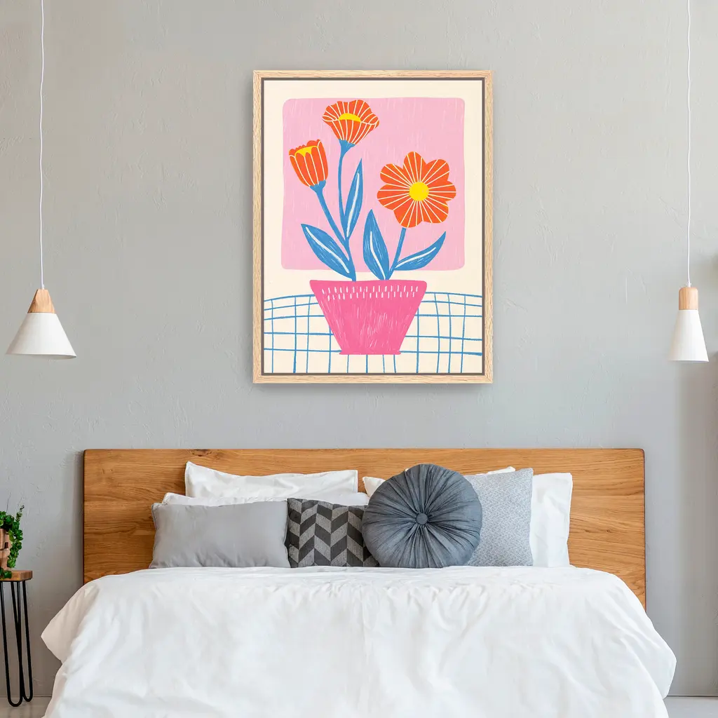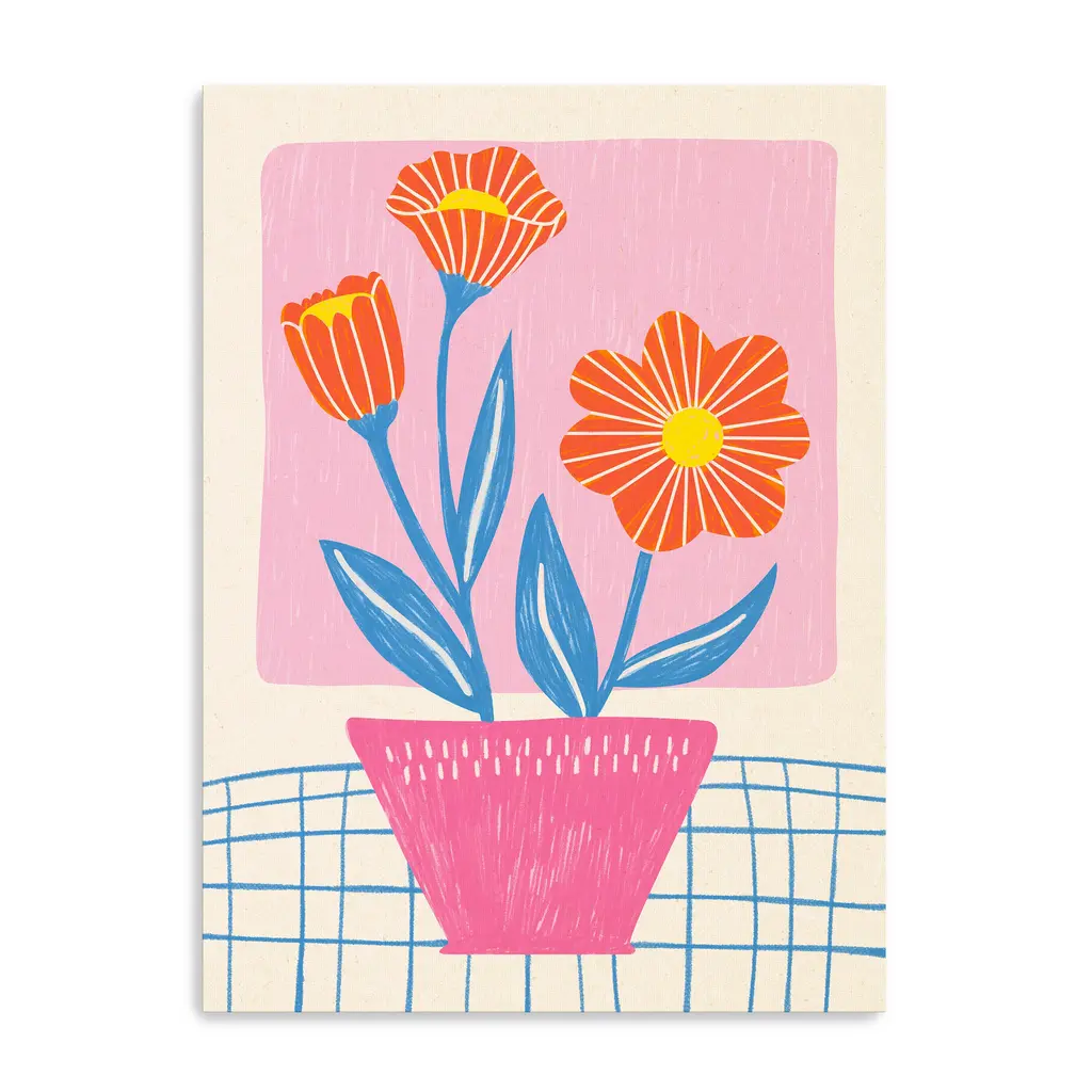 Brighten your space with this playful canvas art featuring a pink pot bursting with orange blooms and blue leaves. The soft pastel palette and graphic charm make it a perfect accent for cozy corners and creative workspaces. Our Gallery Wrap Canvas Prints are proudly assembled with high quality materials in California, USA. Each piece is printed on a thick, archival grade canvas using Giclee technology. It is then hand-stretched by our experienced artisans over solid wood bars, which will not warp over time. The final product is a piece personally crafted for you to confidently display on your wall. Care and Assembly: Ensure that the location of your piece has little to no exposure to heat, sunlight, and moisture. Wipe clean, only if needed. Each piece includes hanging hardware to hang on your wall vertically.