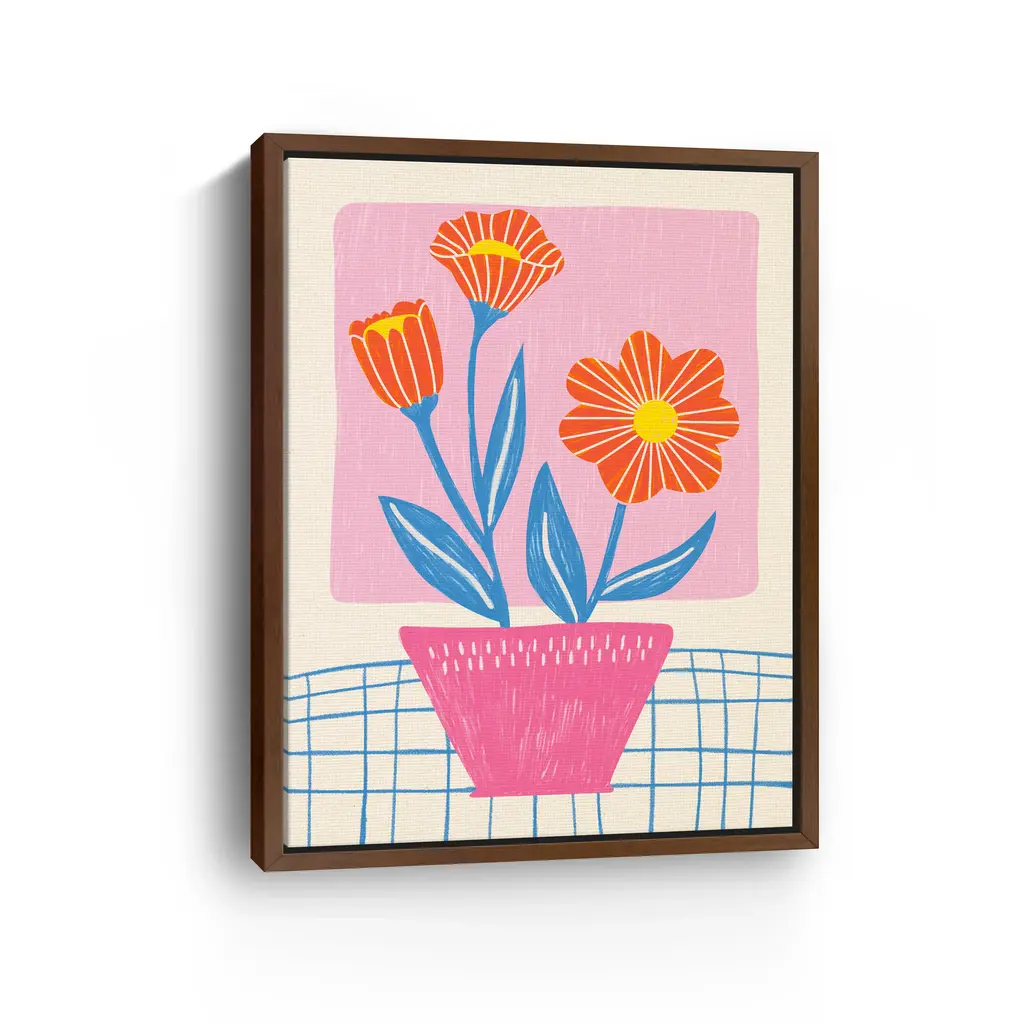 Brighten your space with this playful canvas art featuring a pink pot bursting with orange blooms and blue leaves. The soft pastel palette and graphic charm make it a perfect accent for cozy corners and creative workspaces. Our Gallery Wrap Canvas Prints are proudly assembled with high quality materials in California, USA. Each piece is printed on a thick, archival grade canvas using Giclee technology. It is then hand-stretched by our experienced artisans over solid wood bars, which will not warp over time. The final product is a piece personally crafted for you to confidently display on your wall. Care and Assembly: Ensure that the location of your piece has little to no exposure to heat, sunlight, and moisture. Wipe clean, only if needed. Each piece includes hanging hardware to hang on your wall vertically.