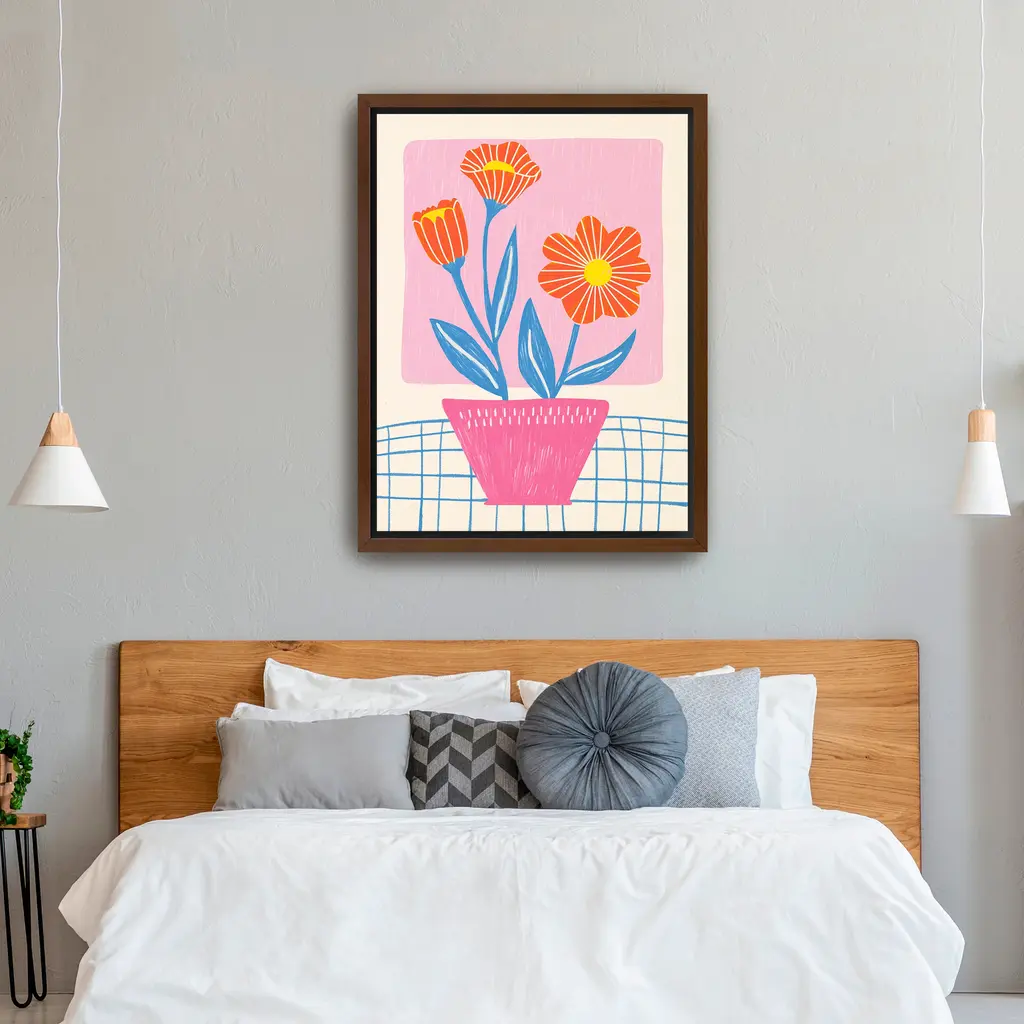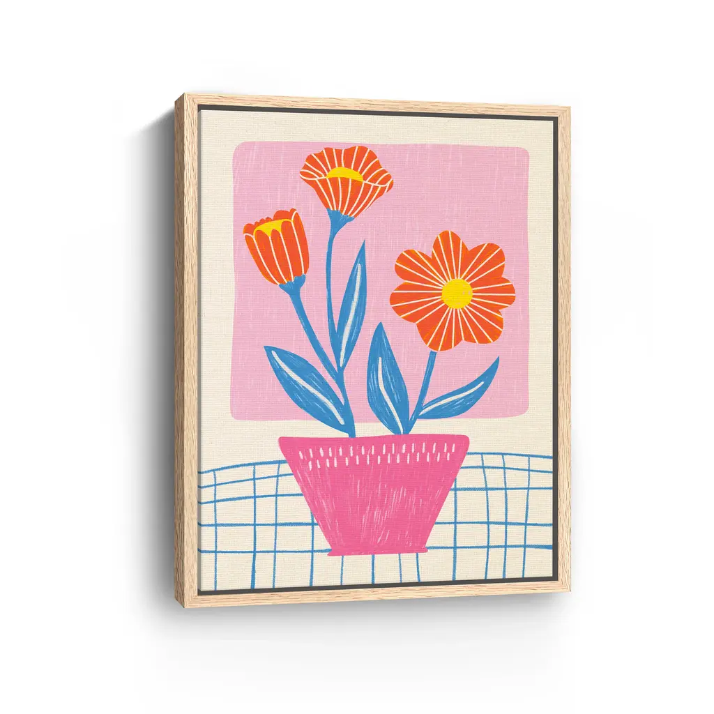 Brighten your space with this playful canvas art featuring a pink pot bursting with orange blooms and blue leaves. The soft pastel palette and graphic charm make it a perfect accent for cozy corners and creative workspaces. Our Gallery Wrap Canvas Prints are proudly assembled with high quality materials in California, USA. Each piece is printed on a thick, archival grade canvas using Giclee technology. It is then hand-stretched by our experienced artisans over solid wood bars, which will not warp over time. The final product is a piece personally crafted for you to confidently display on your wall. Care and Assembly: Ensure that the location of your piece has little to no exposure to heat, sunlight, and moisture. Wipe clean, only if needed. Each piece includes hanging hardware to hang on your wall vertically.