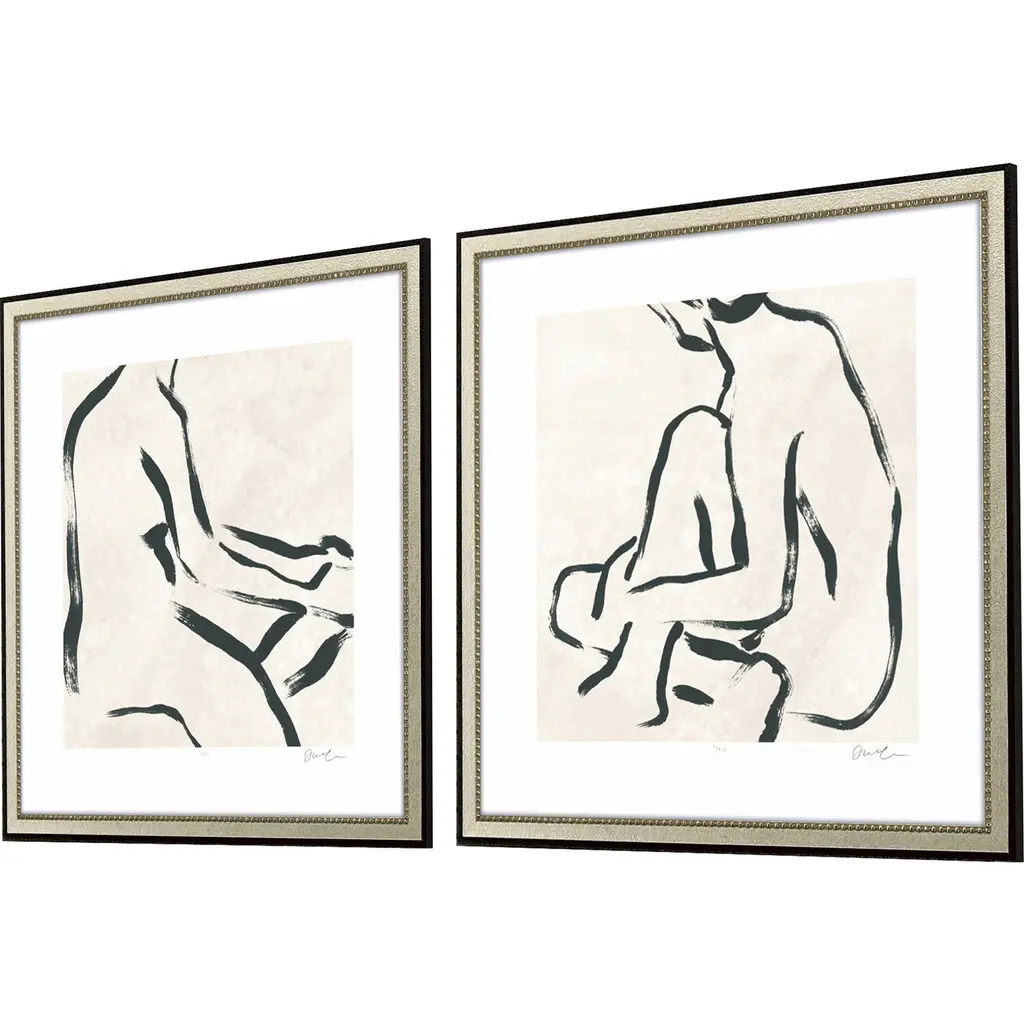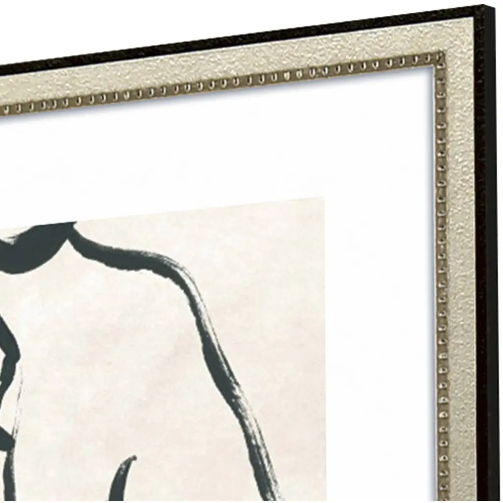 Modern sketches on fine art paper are framed in a traditional step profile wood with distressed silver leaf and beaded lip with black painted edging.