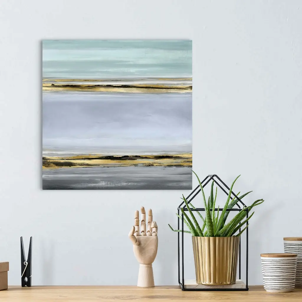 Contemporary artwork featuring two bold black brush strokes overlaid with a gold foil texture on soft blue, gray and green colors.