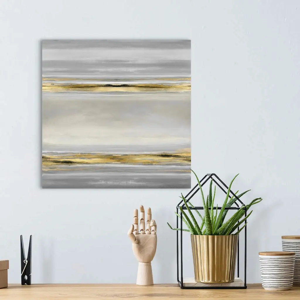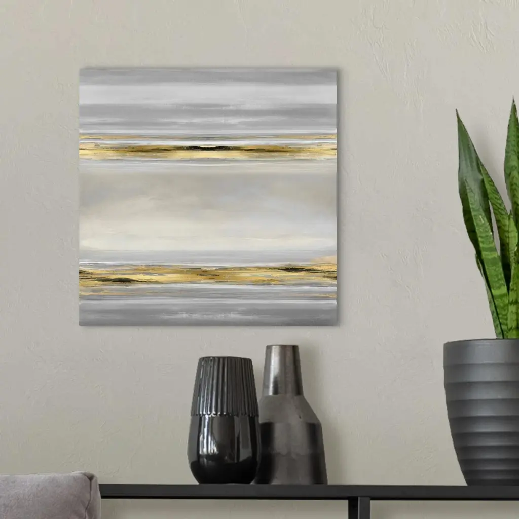 Contemporary artwork featuring two bold black brush strokes overlaid with a gold foil texture on soft gray and beige colors.