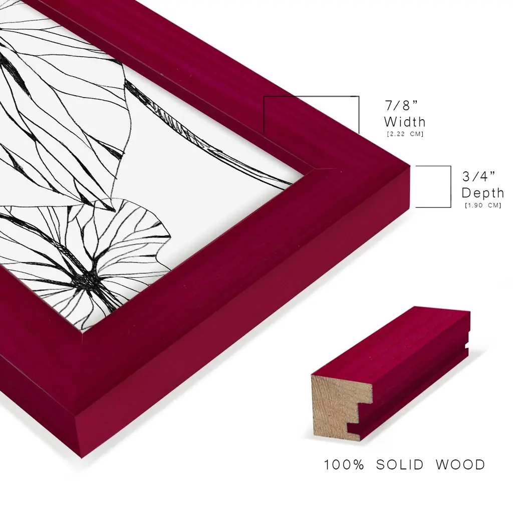 Linear Tropics with Gold II -EZ SWITCH Framed Print w/glass-Cherry Red A delightful, framed print. Featuring a solid wood frame with real wood glass. This premium print is giclee quality. In addition, every frame features a removable back and table top stand. This allows you to change your art in the future or to just stand the art on a table for a new look. We are sure you'll enjoy our new series of EZ SWITCH Framed Art. Solid Wood Frame Real Glass Removable / Replaceable Art Built in Tabletop Stand Sizes range from 4x6 up to 12x15 - buy just one or pair them up as sets as you see fit.